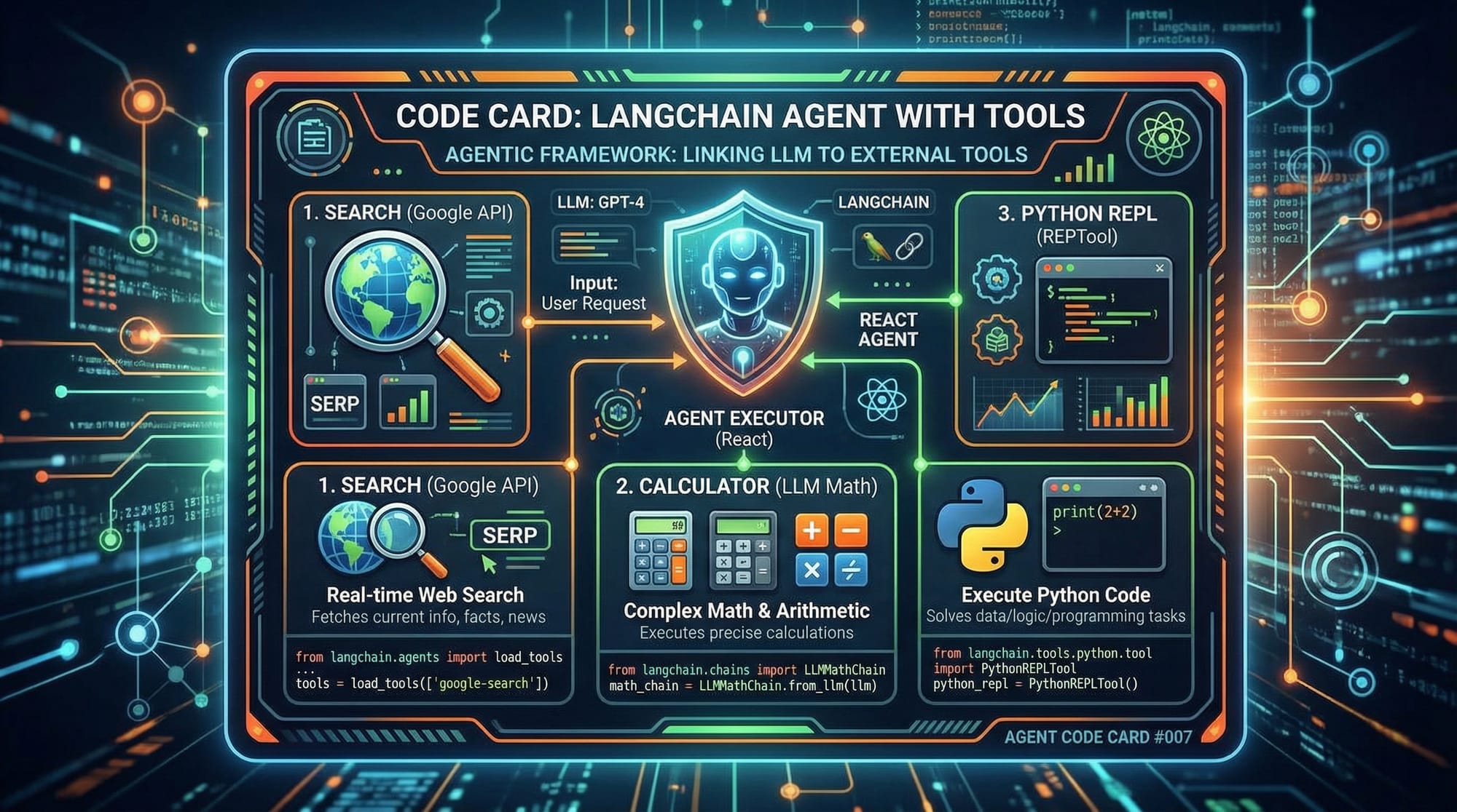 - LangChain: Enables agents to interact with tools like calculators, search engines, and Python environments.
