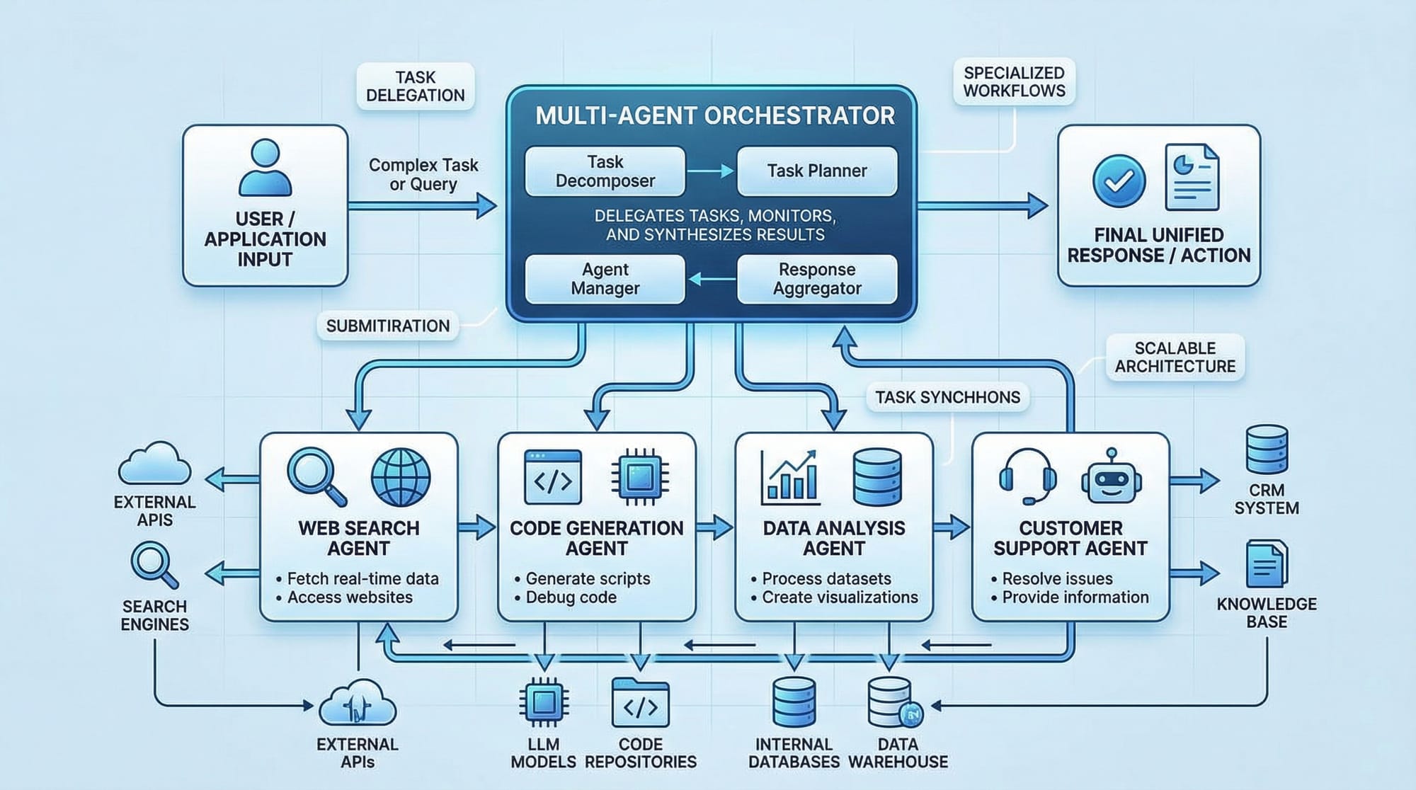 - Multi-agent orchestration allows complex workflows and delegation.