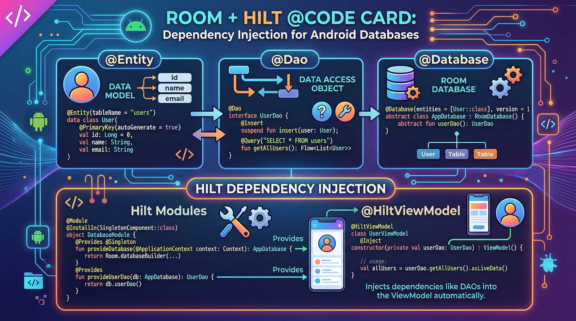 Modern Android apps are no longer built with just Activities and Fragments. Instead, they follow structured architectural patterns that make apps scalable, testable, and maintainable. One of the most popular and industry-recommended approaches is MVVM (Model-View-ViewModel) combined with Room Database for local storage and Hilt Dependency Injection for managing dependencies.