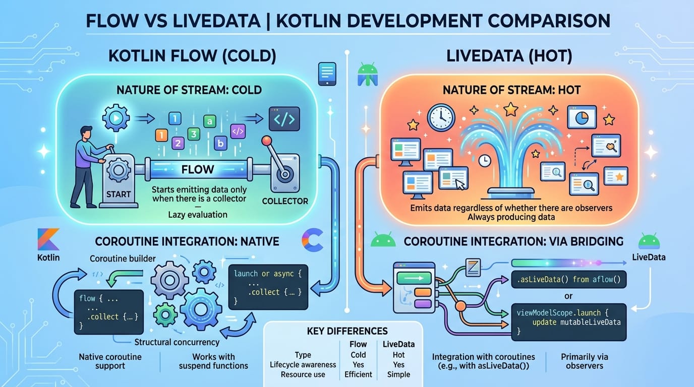 Use Flow for modern apps with coroutines. LiveData is still useful but Flow is more powerful and flexible.