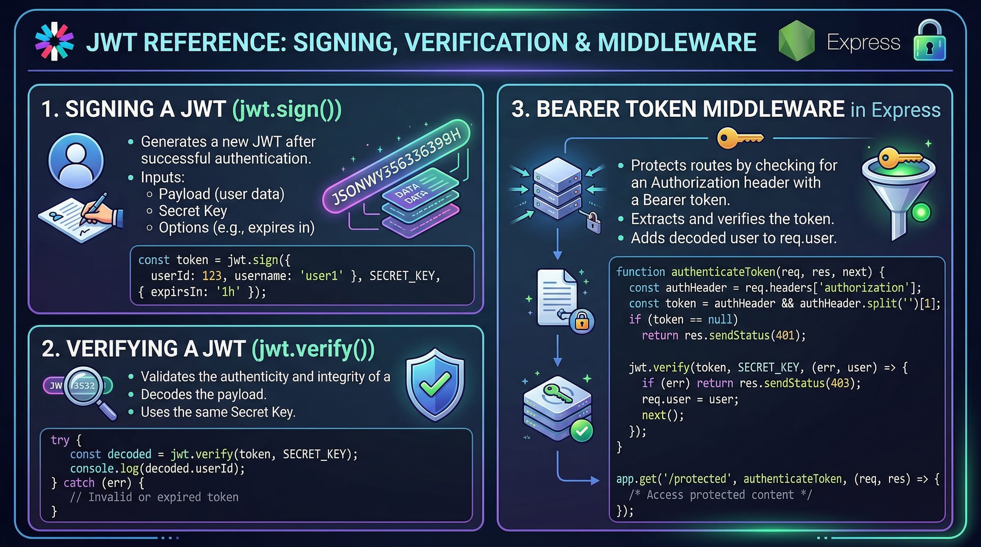 express()creates serverjwt.sign()generates tokenjwt.verify()checks token validity- Middleware protects routes