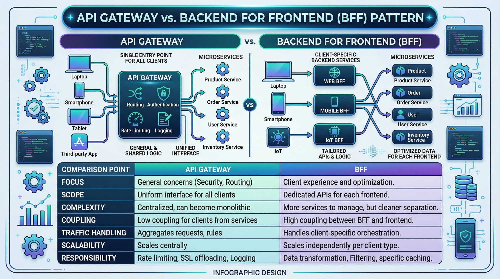 - Decoupling frontend from multiple backend services.