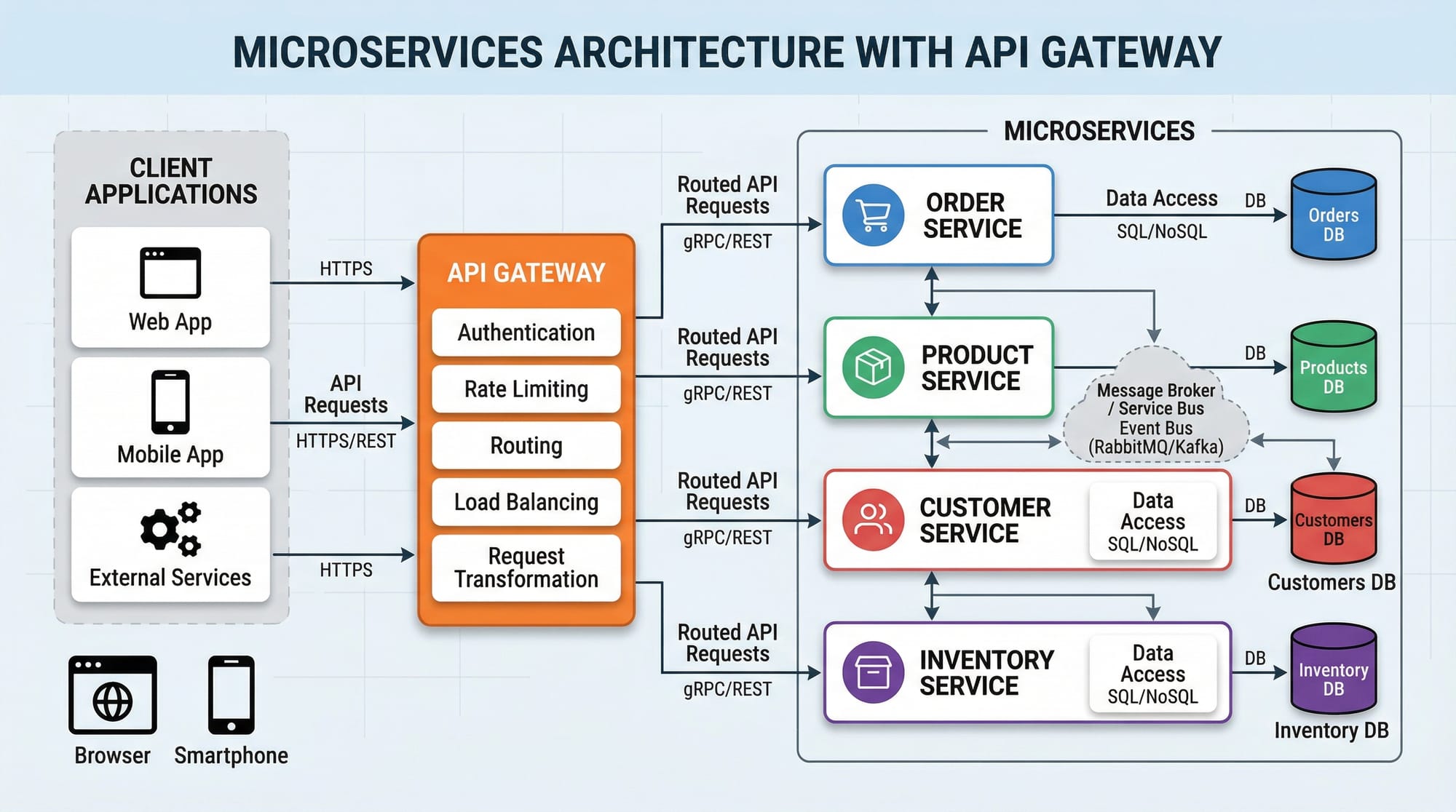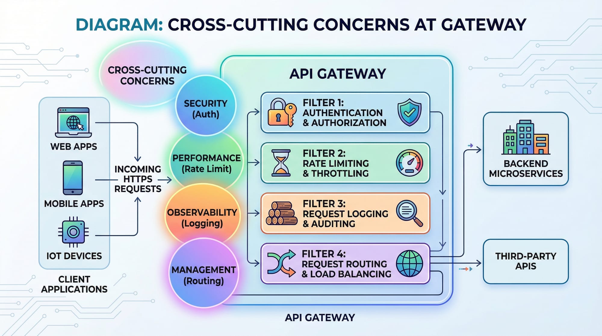 - API Gateway centralizes routing, authentication, rate limiting, logging, and caching.