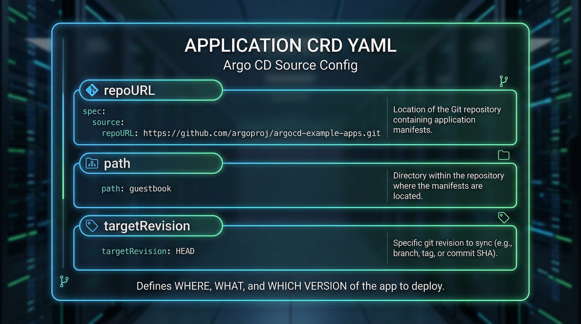 repoURL: Git repository storing Kubernetes manifestspath: Directory path inside the repositorytargetRevision: Branch, tag, or commitdestination: Cluster and namespace