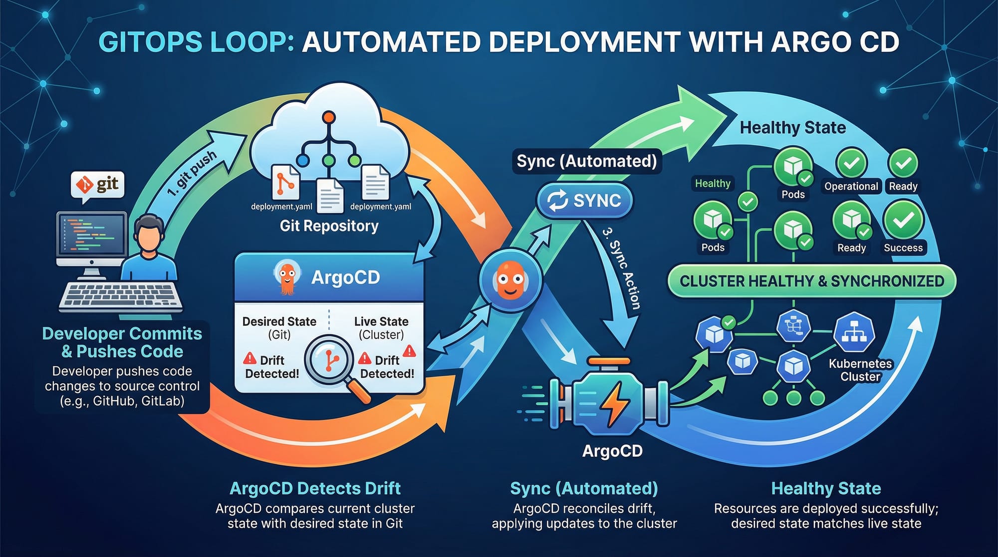 - ArgoCD ensures the cluster state matches the desired state in Git.