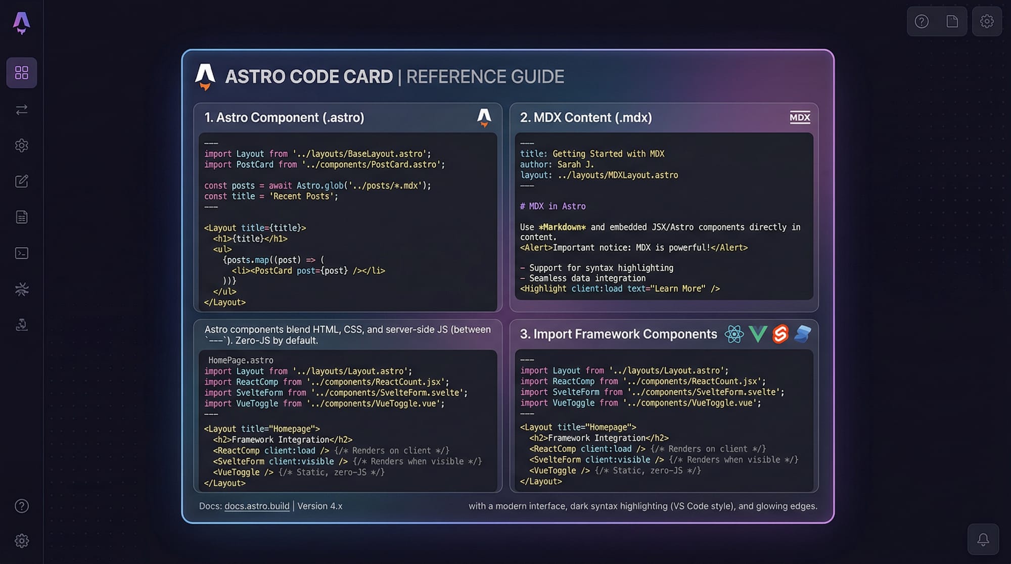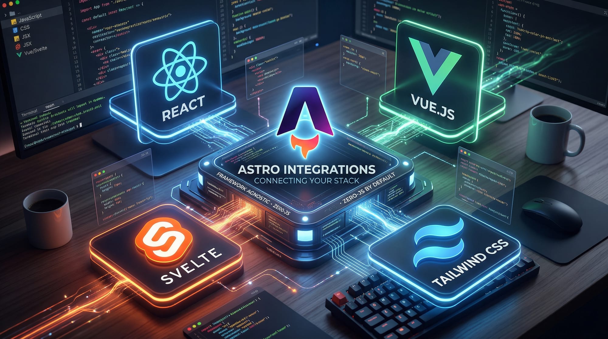 Astro uses .astro files as its core building blocks. These files allow you to combine HTML, JavaScript, and framework components in one place.