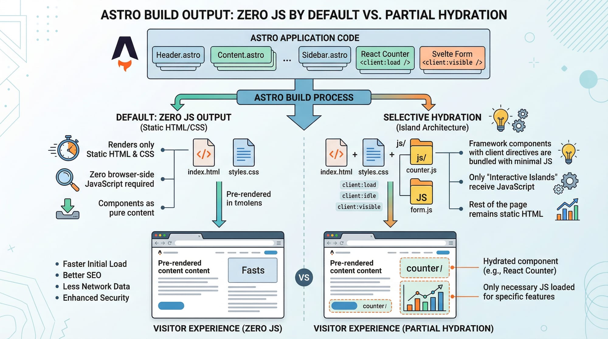 Astro sends zero JavaScript by default and only loads JS when needed. This results in faster load times and better user experience.