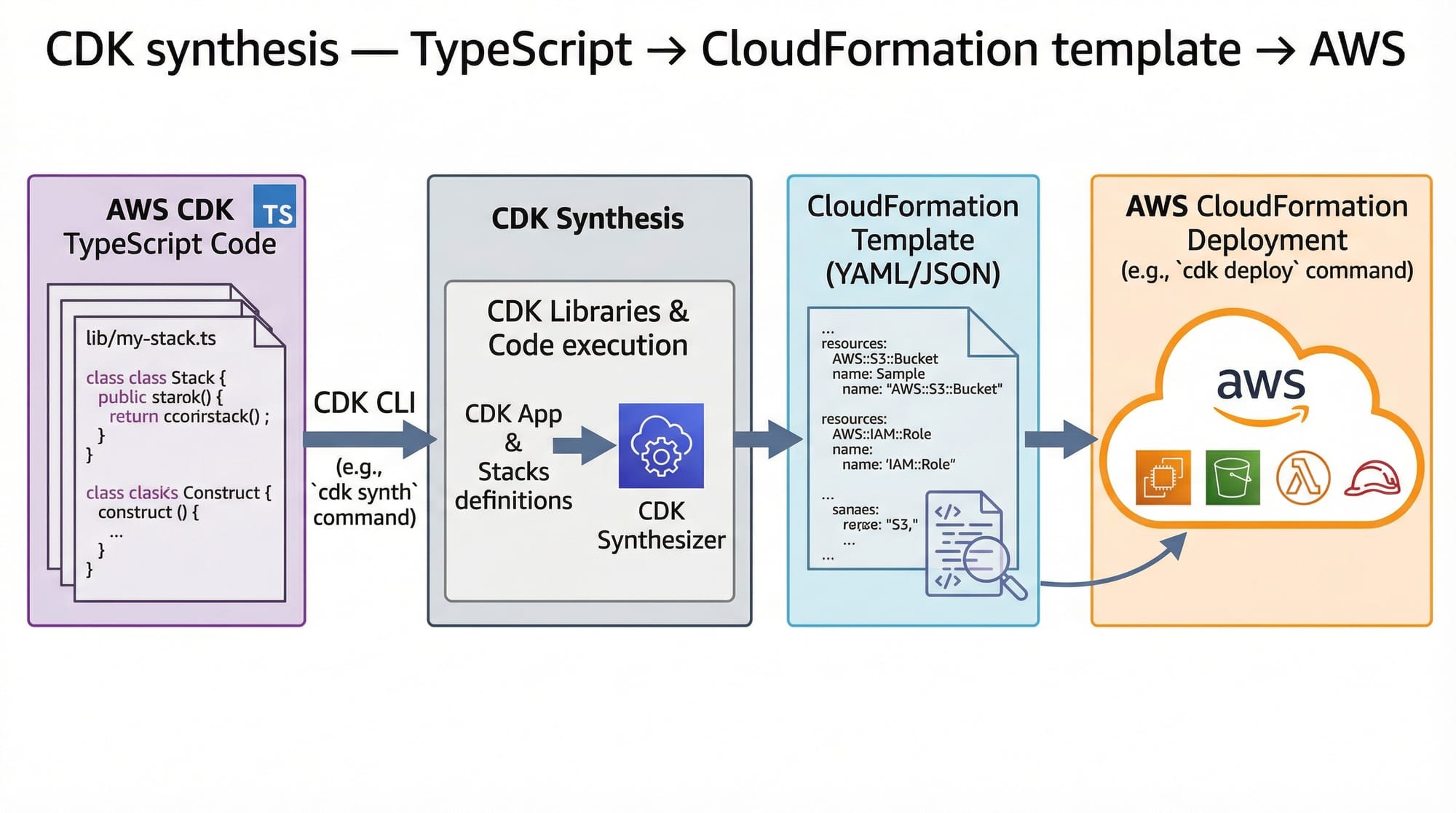 cdk synth: Converts TypeScript into CloudFormationcdk deploy: Deploys to AWS