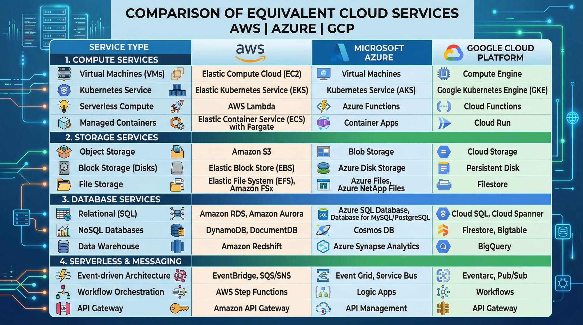 | Containers | ECS/EKS | Azure Kubernetes | GKE |