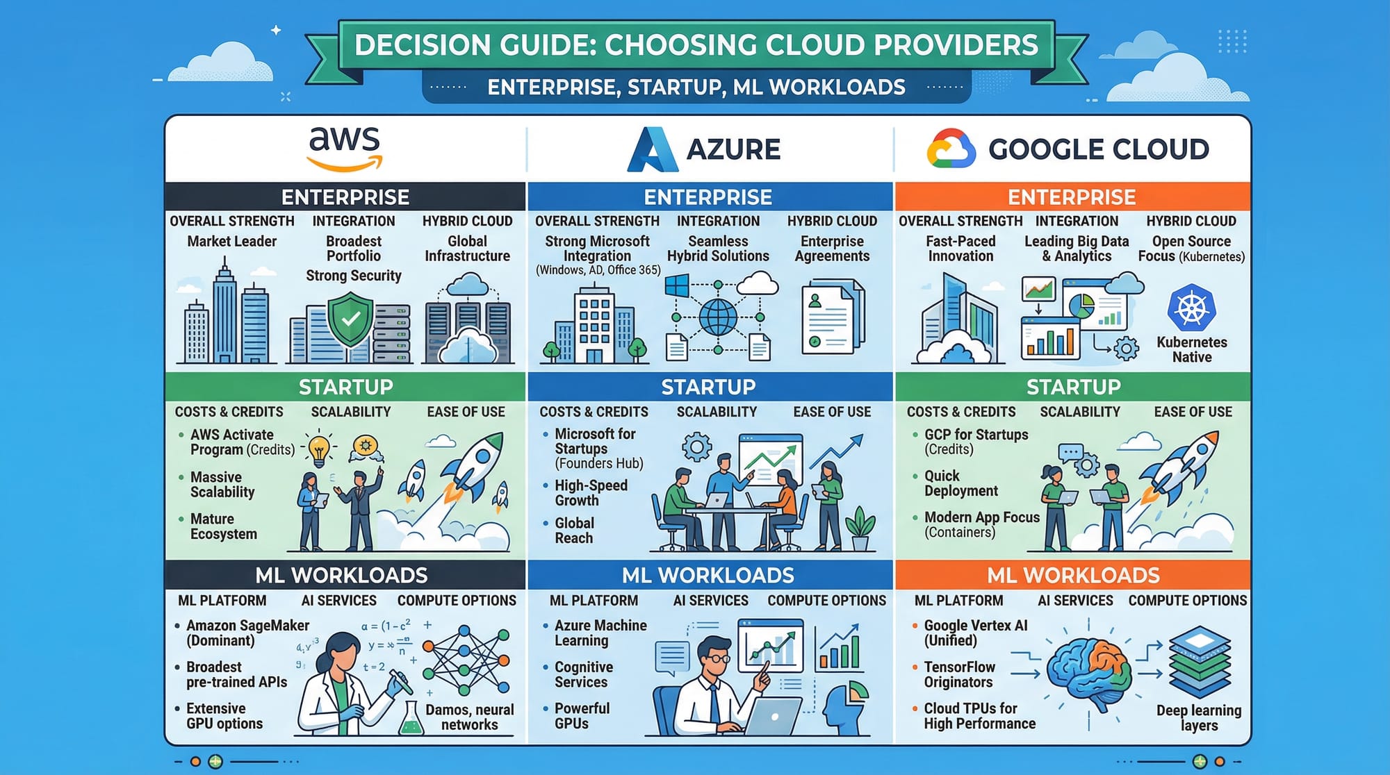 - GCP: Strong in AI/ML and data analytics; competitive pricing and simplified deployment.