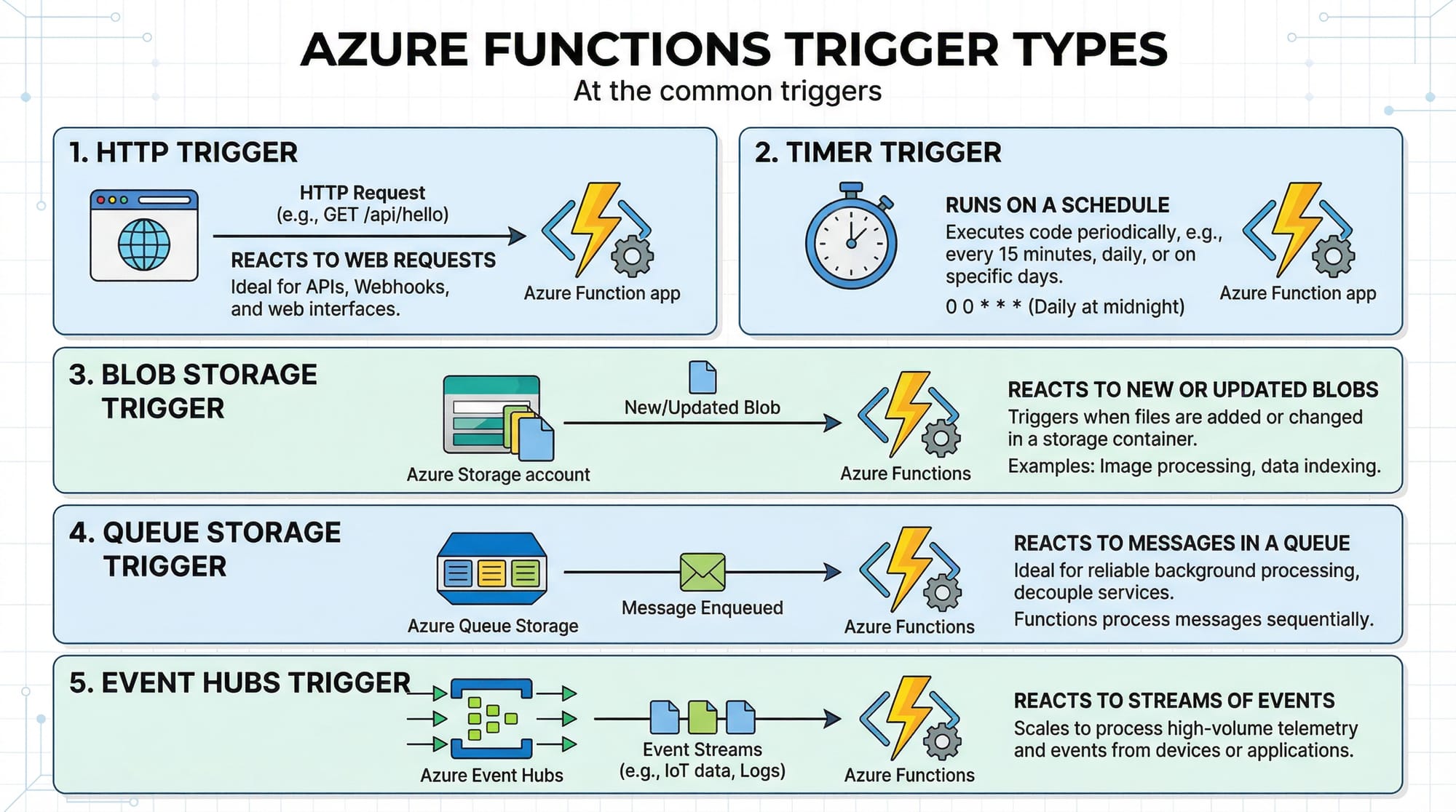 - Azure Functions enable event-driven, serverless applications