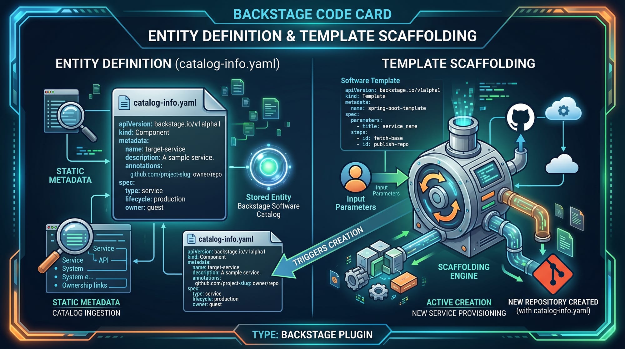 kind: Templatedefines scaffolding templateparametersdefine form inputs (service name, owner)stepsdefine automated actionsfetch:templatecopies starter code