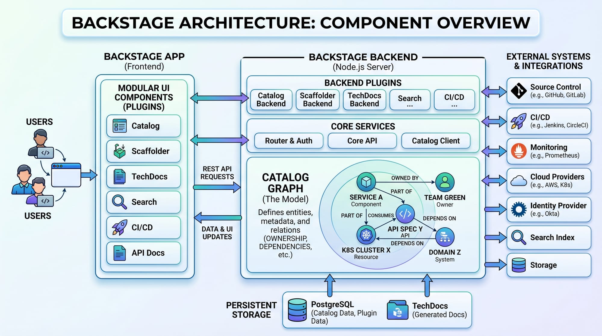 The Software Catalog is the heart of Backstage. It stores information about all services, APIs, libraries, and data pipelines in your organization.