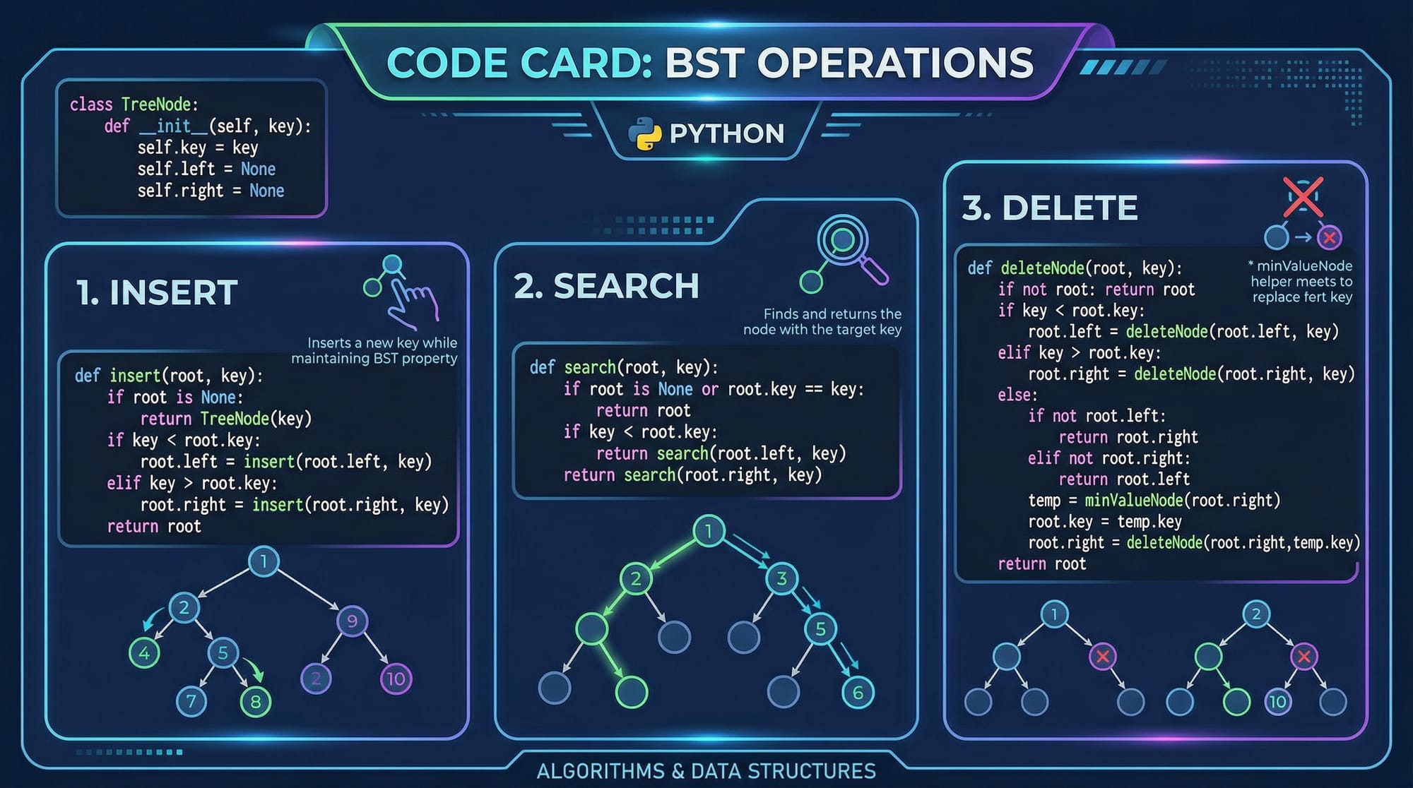 search()→ Finds a value in BSTroot is None→ Value not foundroot.value == key→ Value foundkey < root.value→ Search leftelse→ Search right