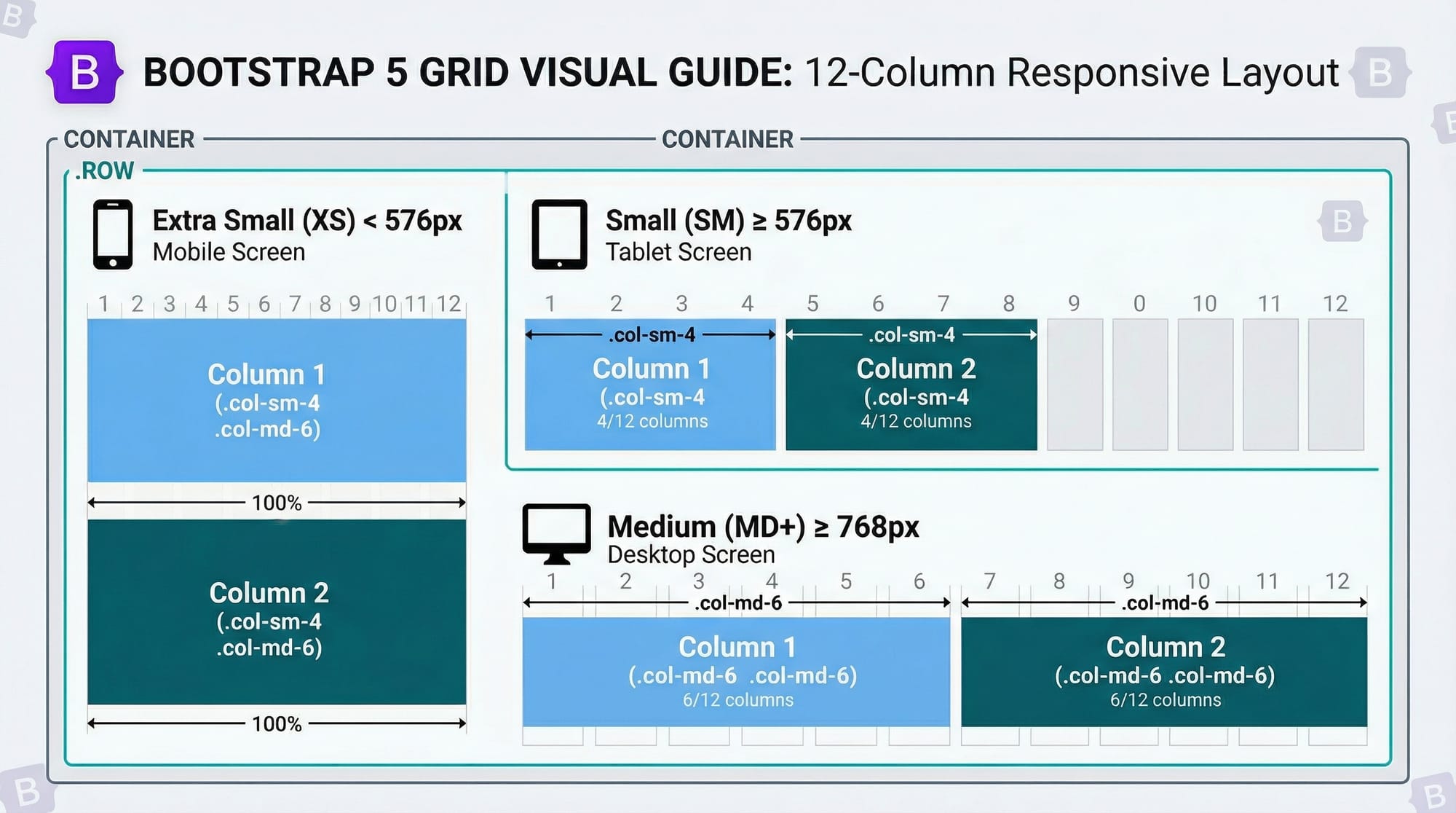 .container→ Wraps the content and provides padding..row→ Creates a horizontal group of columns..col-sm-4→ Column takes 4/12 of width on small devices..col-md-6→ Column takes 6/12 of width on medium devices..d-none d-md-block→ Hides the column on small devices, shows on medium+.