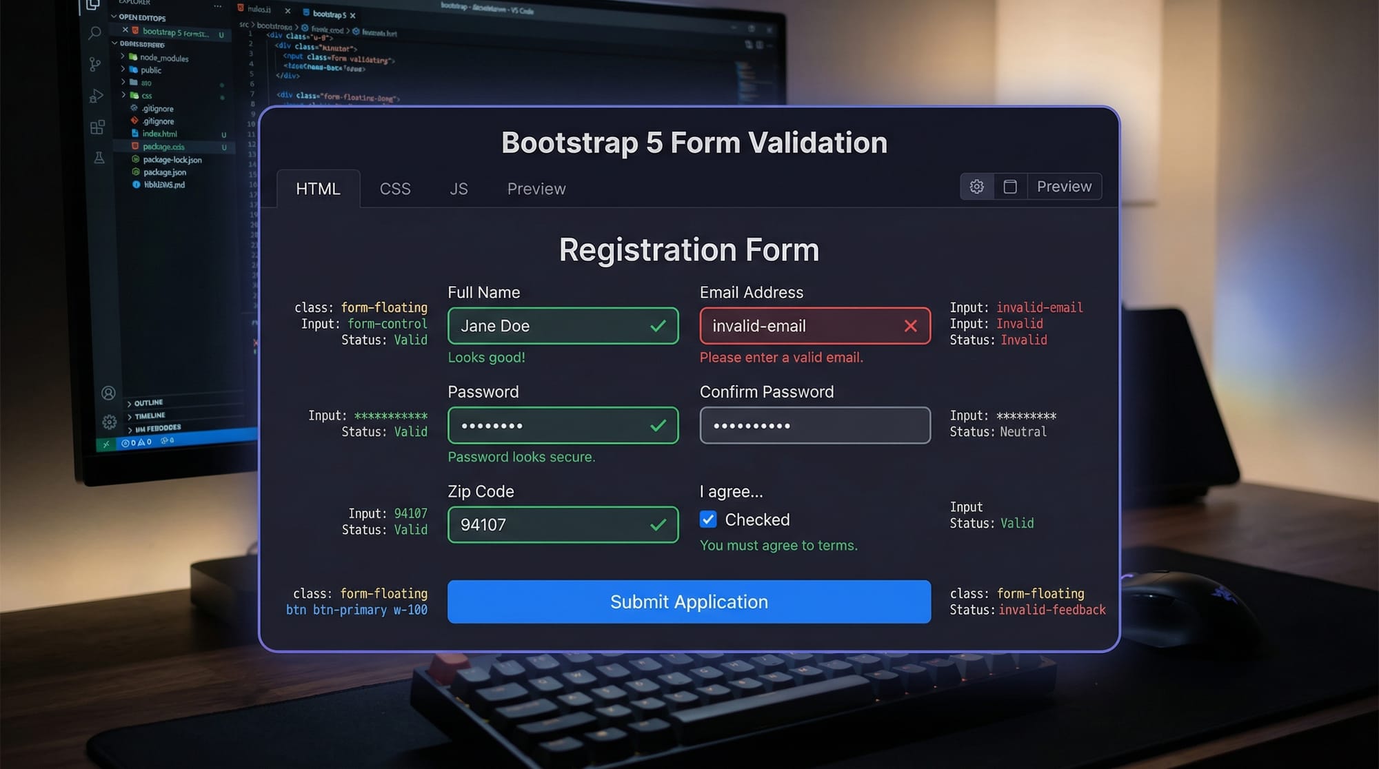 .needs-validation→ Enables Bootstrap validation.novalidate→ Prevents default HTML validation..mb-3→ Margin bottom spacing..form-control→ Styled input fields..invalid-feedback→ Error messages for invalid input.