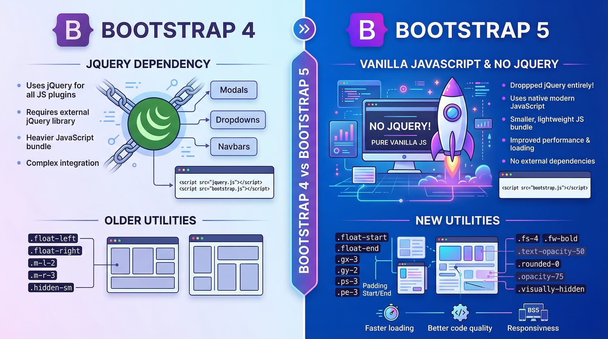 Bootstrap 5 dropped jQuery dependency, introduced new utilities, and improved responsiveness for modern devices.