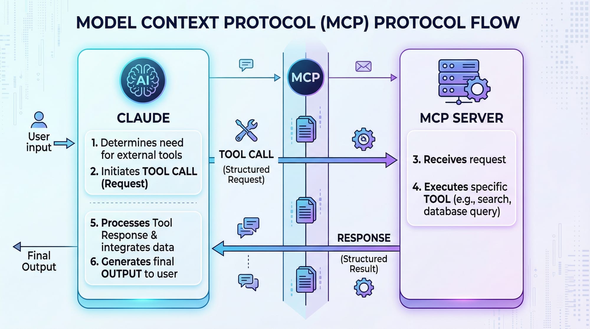 The MCP protocol ensures structured communication between Claude and your tools: