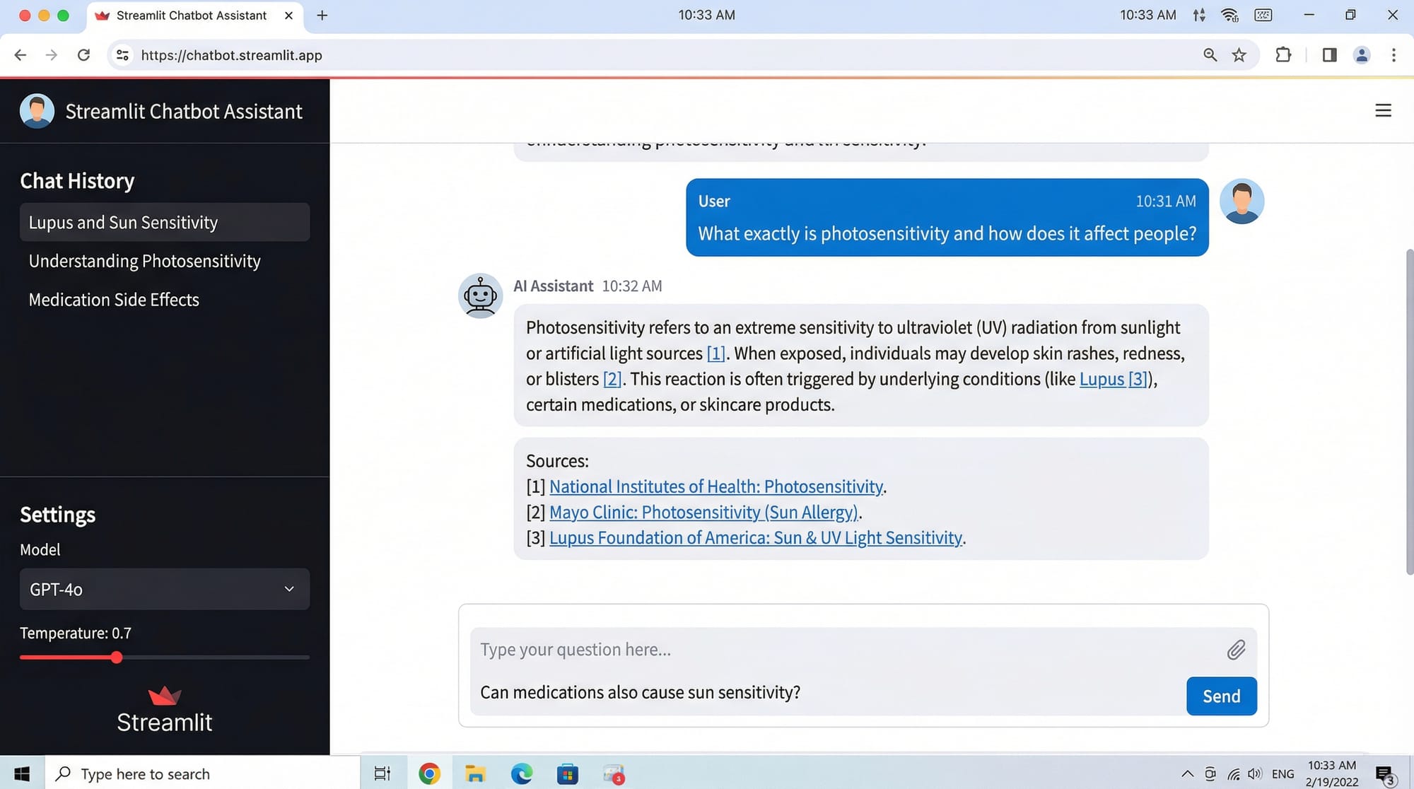 Yes, using Streamlit, you can build an interactive UI with input boxes, chat history, and source citations.