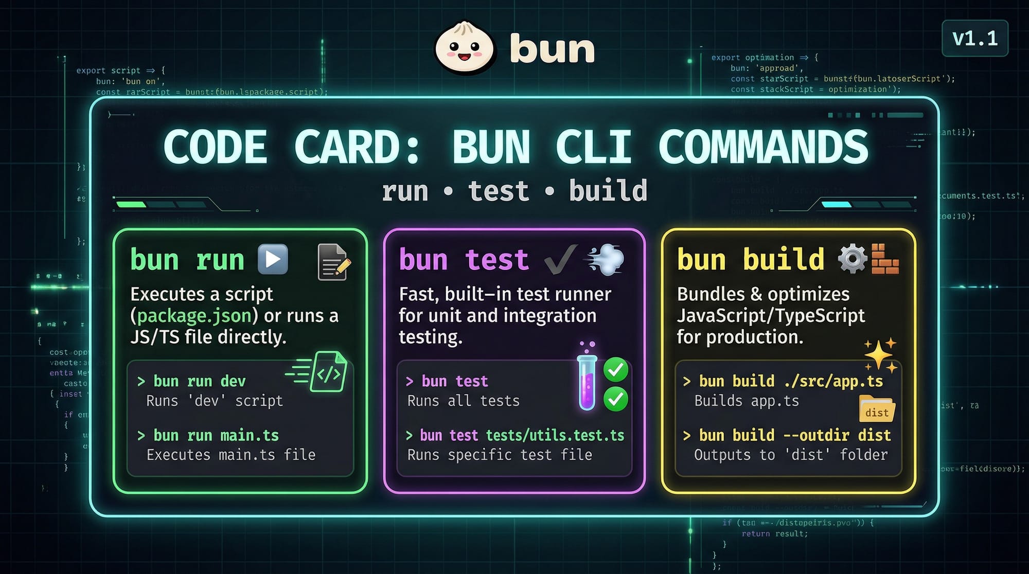 bun run— Executes a JavaScript or TypeScript file.bun test— Runs tests with minimal setup.bun build— Bundles your app for production.