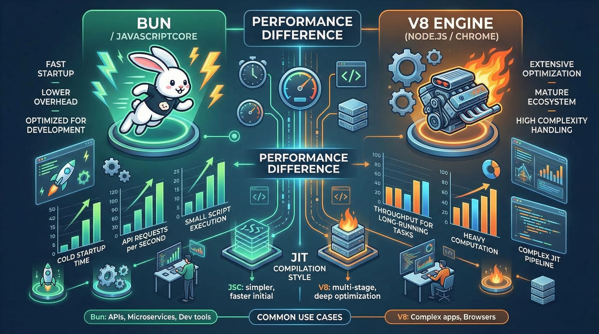 Bun is built on JavaScriptCore, the same engine powering Safari. This makes it extremely fast compared to Node.js’s V8 engine, especially for startup times and file operations. Bun integrates multiple tools directly, meaning fewer dependencies and less configuration for students building apps.