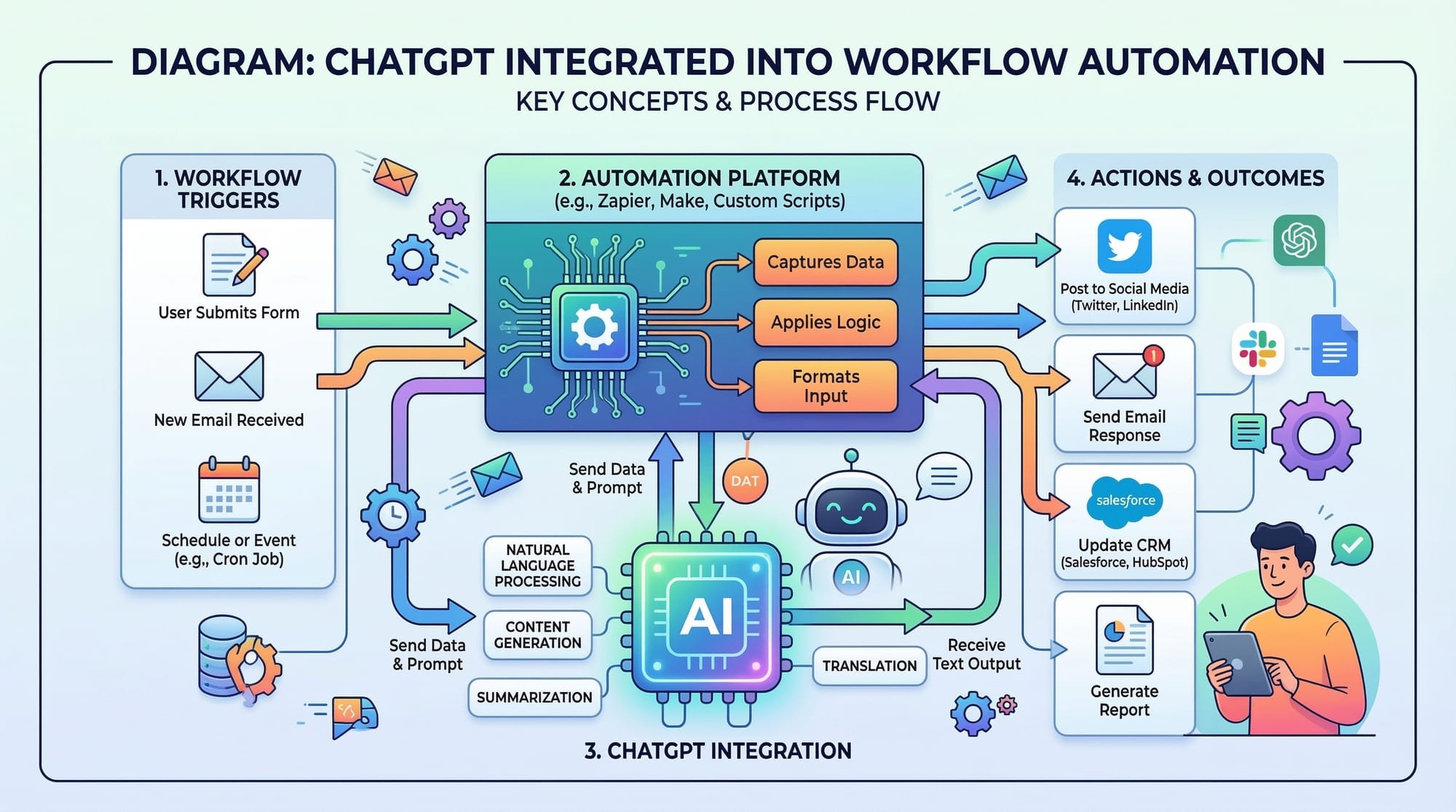 Workflow automation involves connecting multiple steps in a process so that tasks are executed automatically in sequence. ChatGPT can fit into such workflows to handle the content generation or decision-making step.