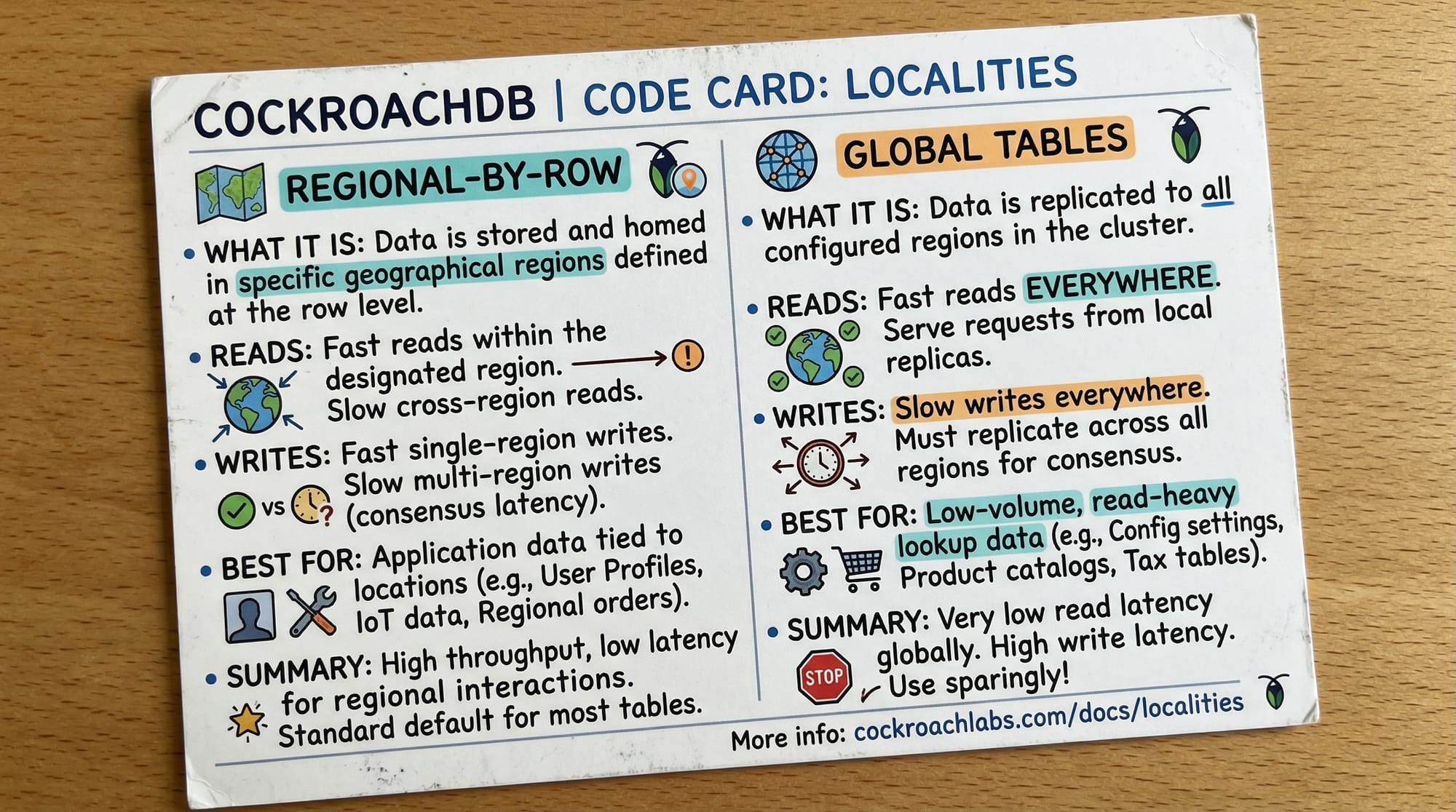 CockroachDB supports multi-region deployments, allowing you to place data close to users. You can define regional by row or global tables:
