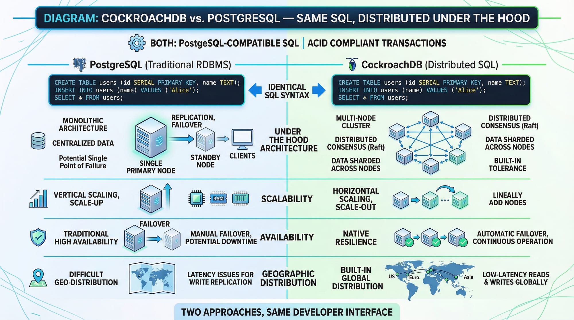 - CockroachDB is a distributed SQL database with PostgreSQL compatibility