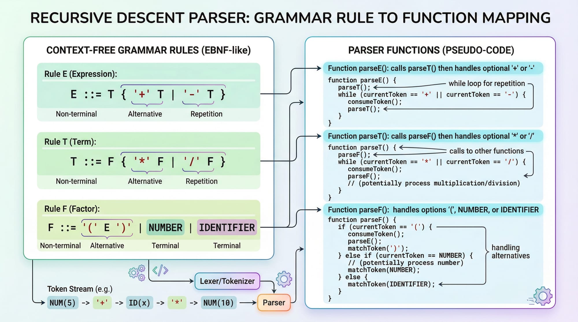 - Parsers can be top-down (recursive descent) or bottom-up (shift-reduce).