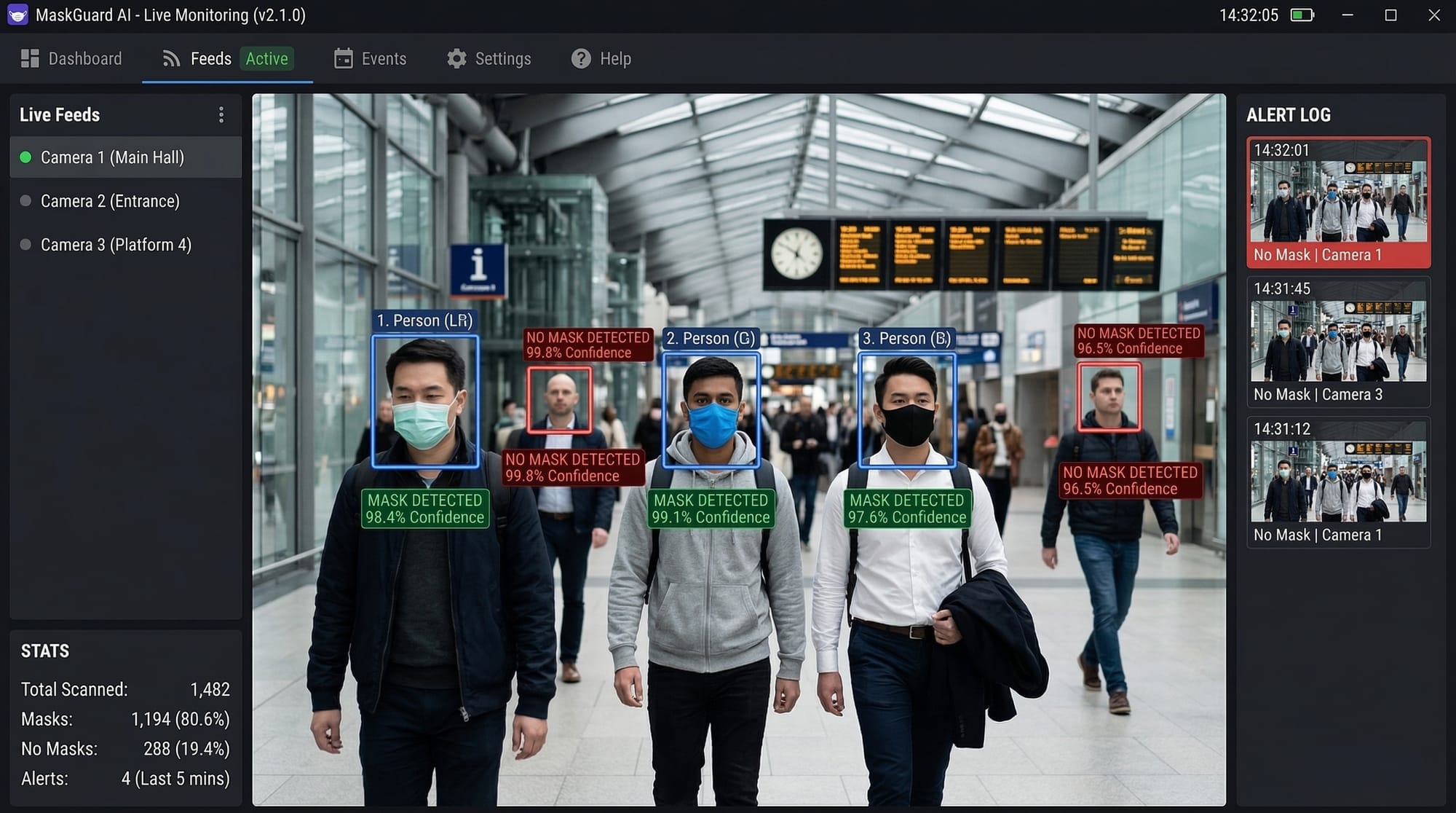 - Predicts if a person is wearing a mask and overlays the result.