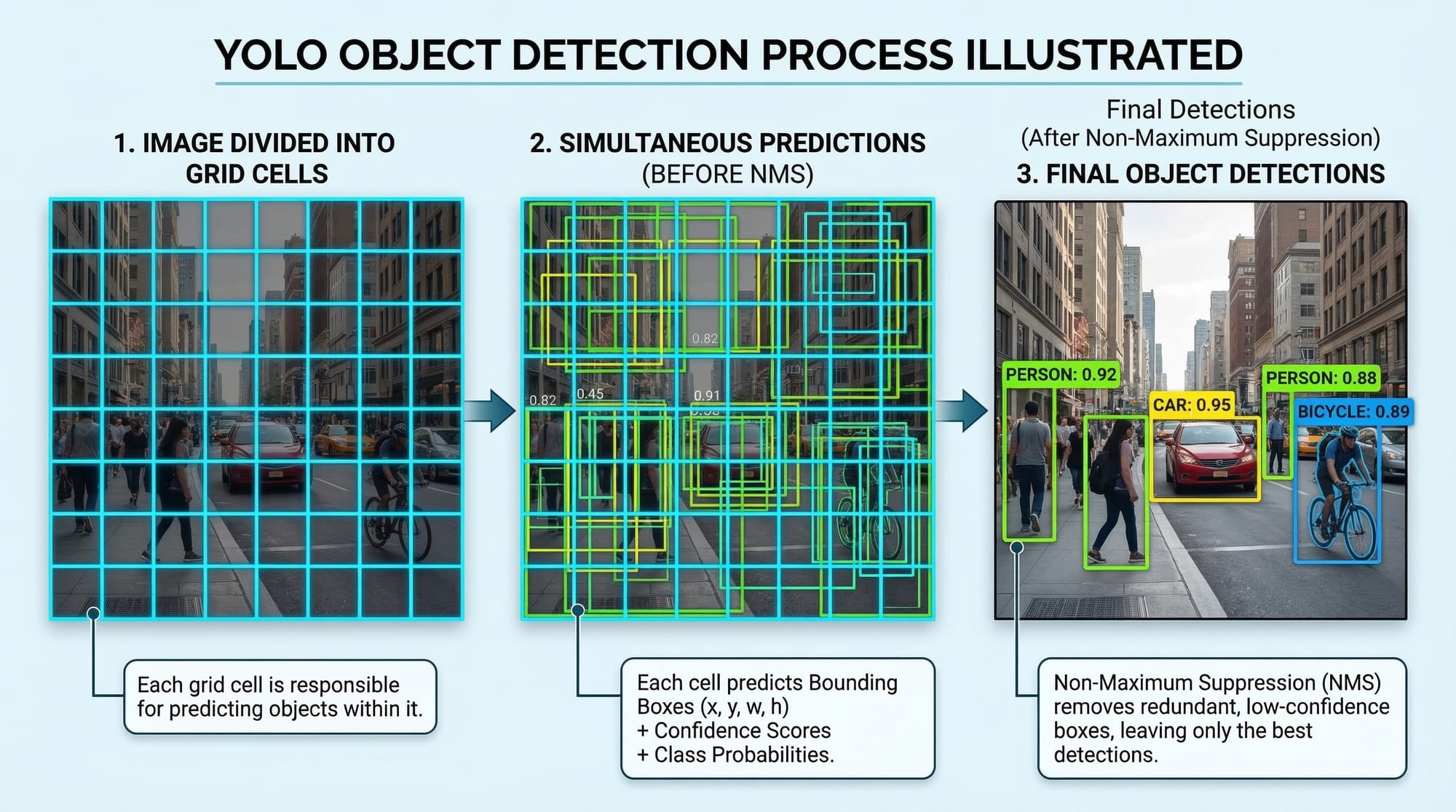 cv2.dnn.readNet()loads the pre-trained YOLO model.cv2.dnn.blobFromImage()prepares the image for the neural network.net.forward()returns the detected objects and their probabilities.
