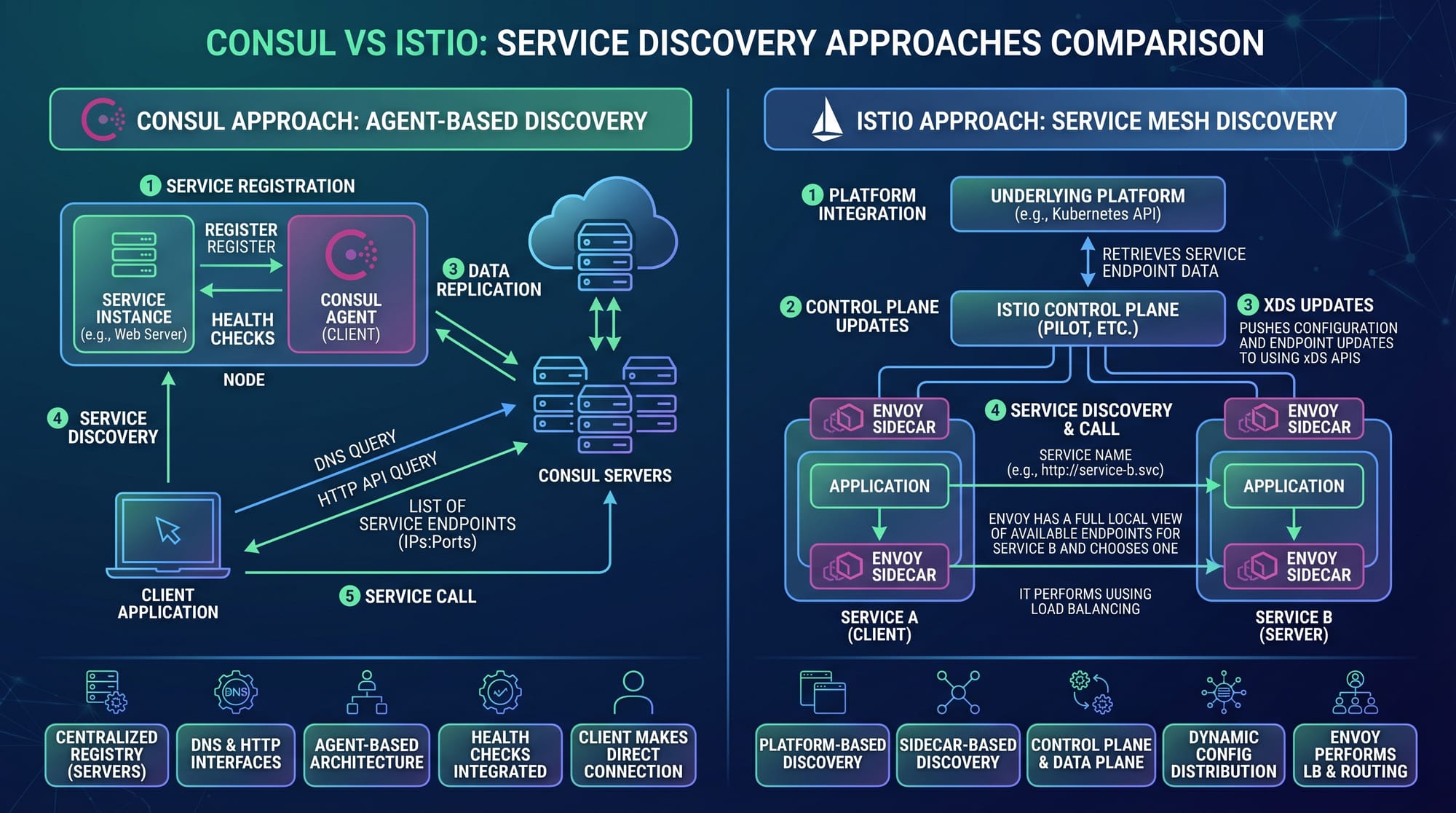 Consul includes service discovery + configuration + service mesh features, while tools like Istio mainly focus on service mesh networking inside Kubernetes.
