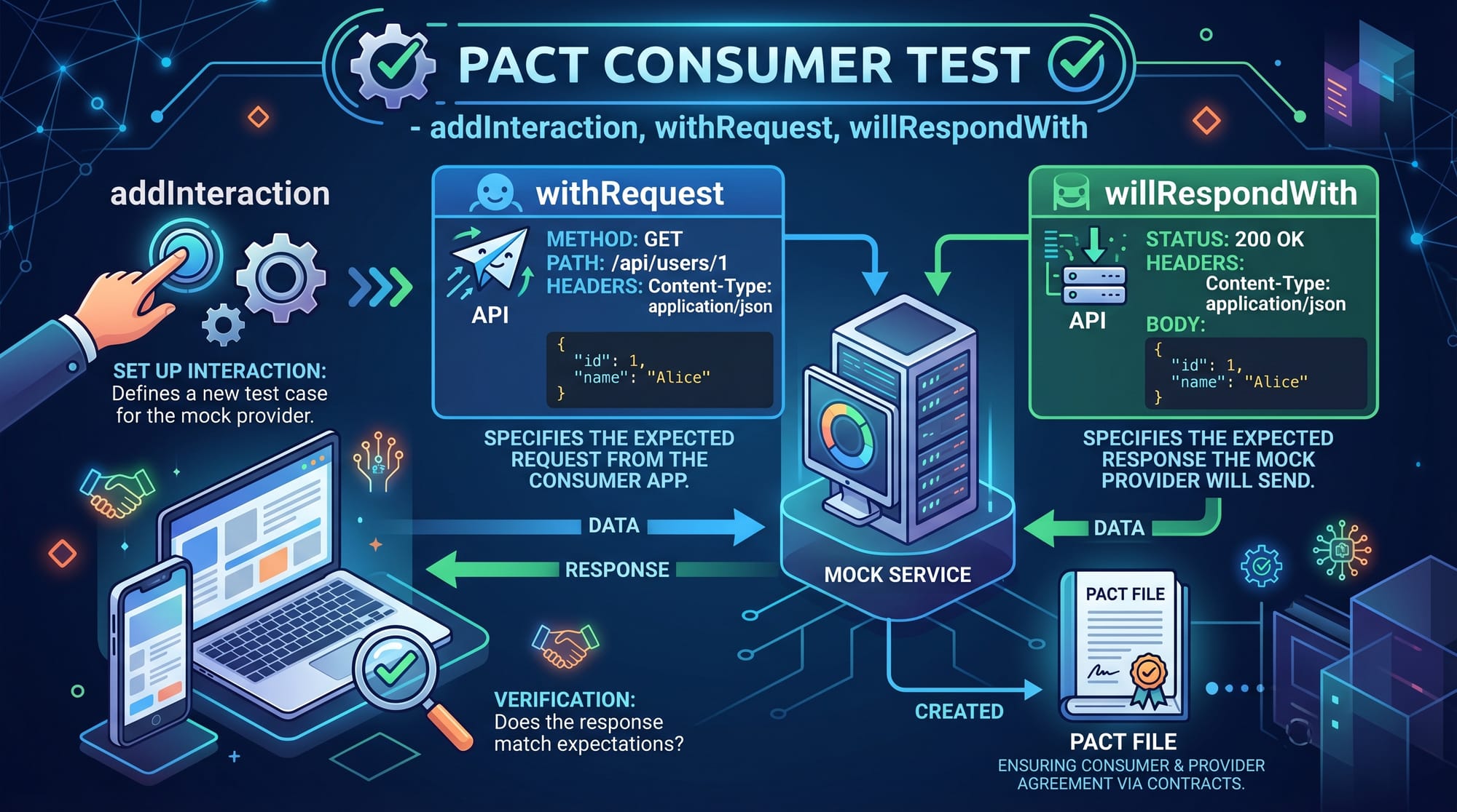 require('@pact-foundation/pact'): Imports Pact libraryconsumer: Name of frontend or consuming serviceprovider: Name of backend serviceport: Local mock server portdir: Folder where contract files are storedprovider.setup(): Starts mock serveraddInteraction(): Defines expected API interactionstate: Precondition for testwithRequest: Defines API request structurewillRespondWith: Expected API response
