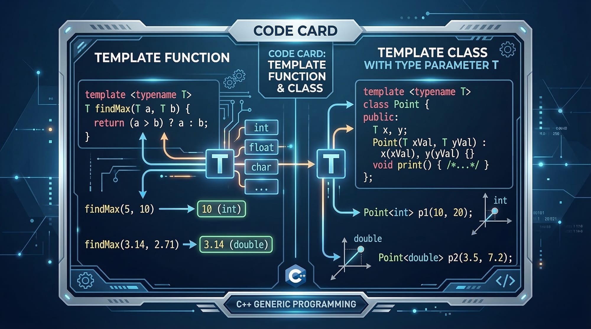 template <typename T>→ Declares a template with typeT.T add(T a, T b)→ Function that works with any type.add<int>(5,3)→ Uses integers.add<double>(2.5,3.7)→ Uses double values.