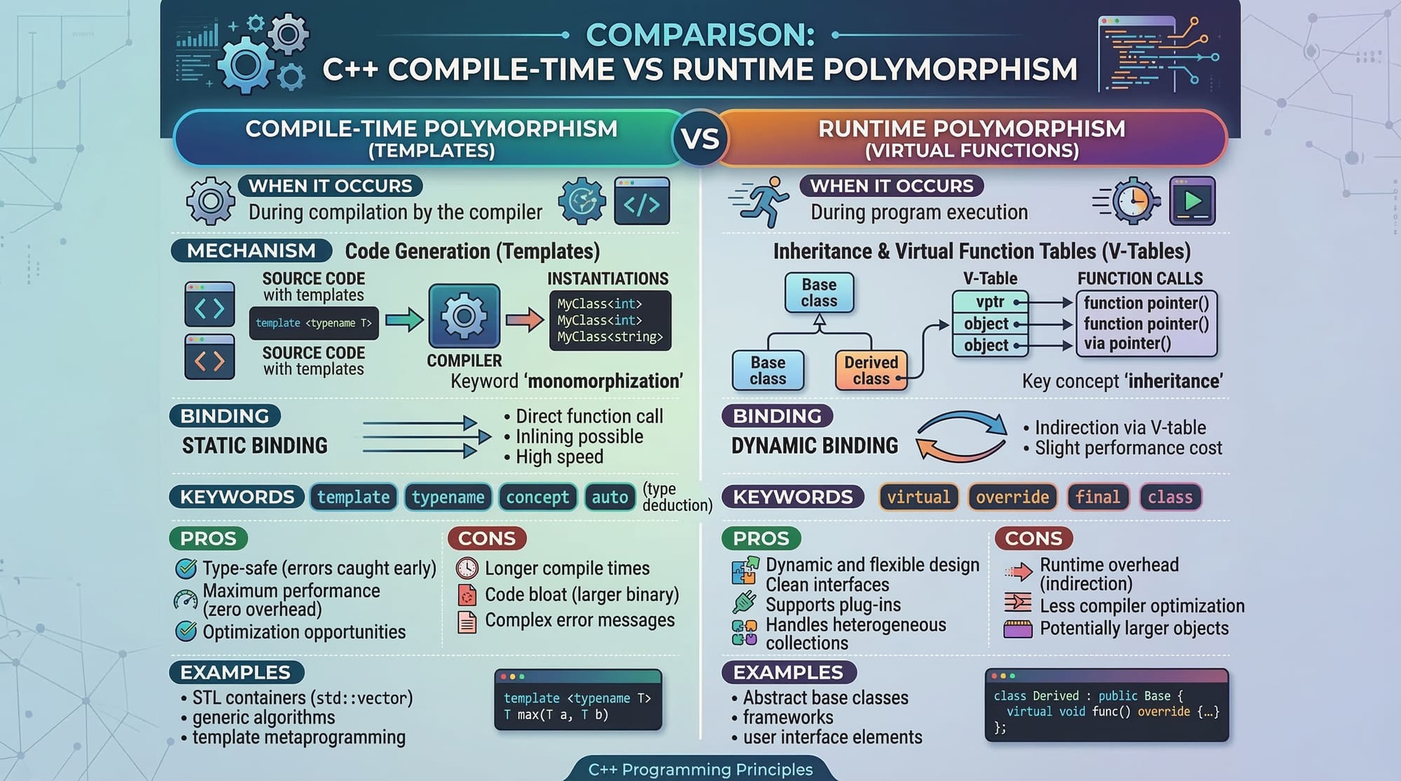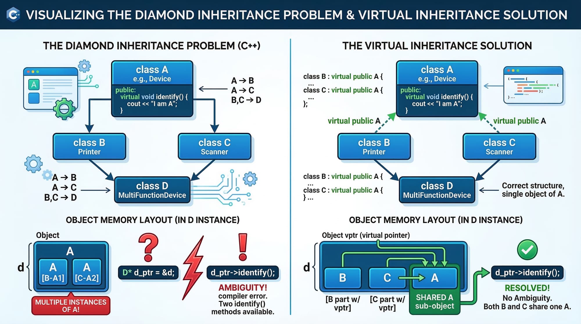 virtual void sound()→ Declares a virtual function.Cat : public Animal→ Cat inherits Animal.Animal* a→ Pointer to base class.a = &c→ Points to Cat object.a->sound()→ Calls Cat’s version due to runtime polymorphism.