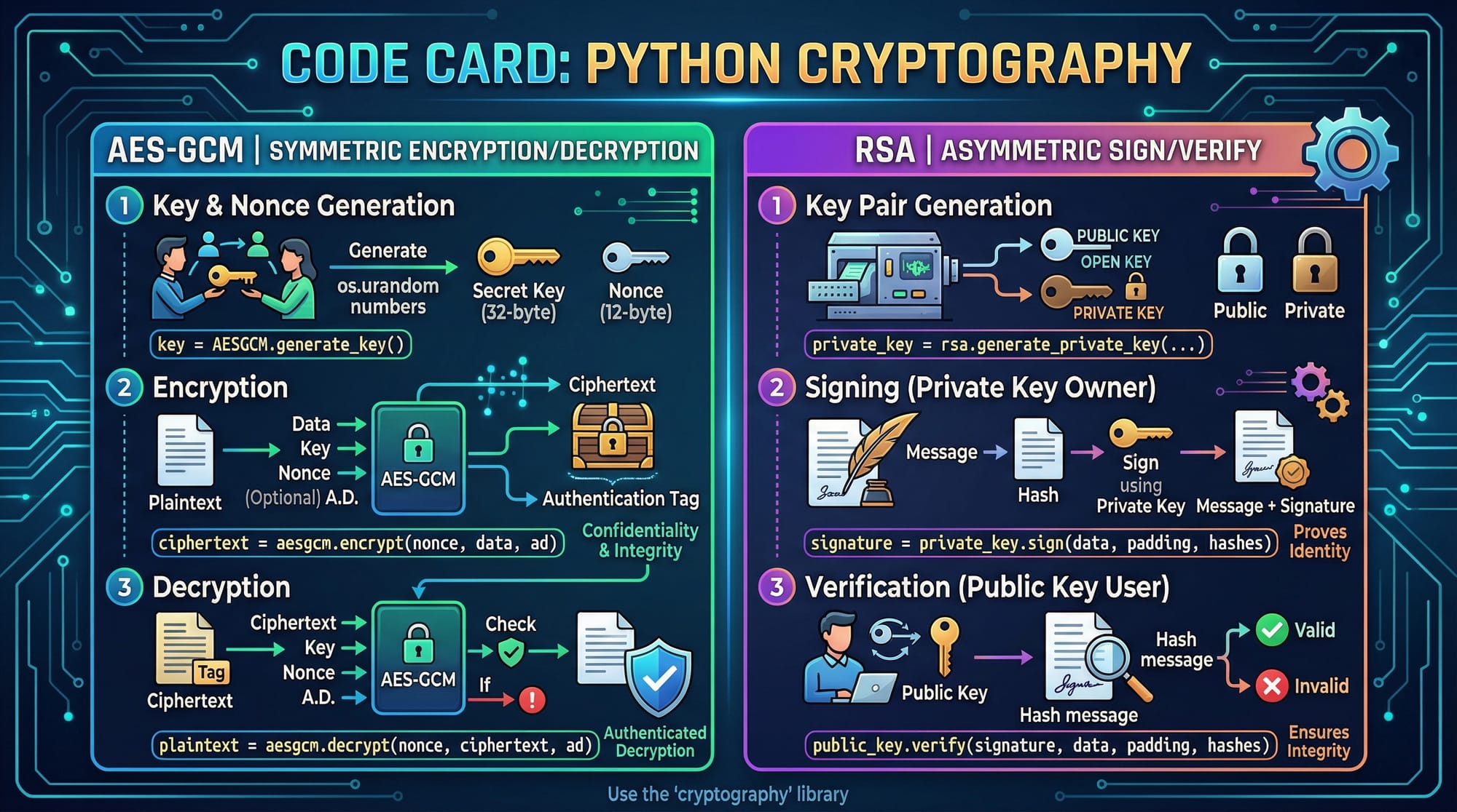 AESGCM.generate_key()→ Generates a secure random keyAESGCM(key)→ Initializes encryption objectos.urandom(12)→ Creates a nonce (random value)encrypt()→ Encrypts plaintextdecrypt()→ Converts ciphertext back to original data