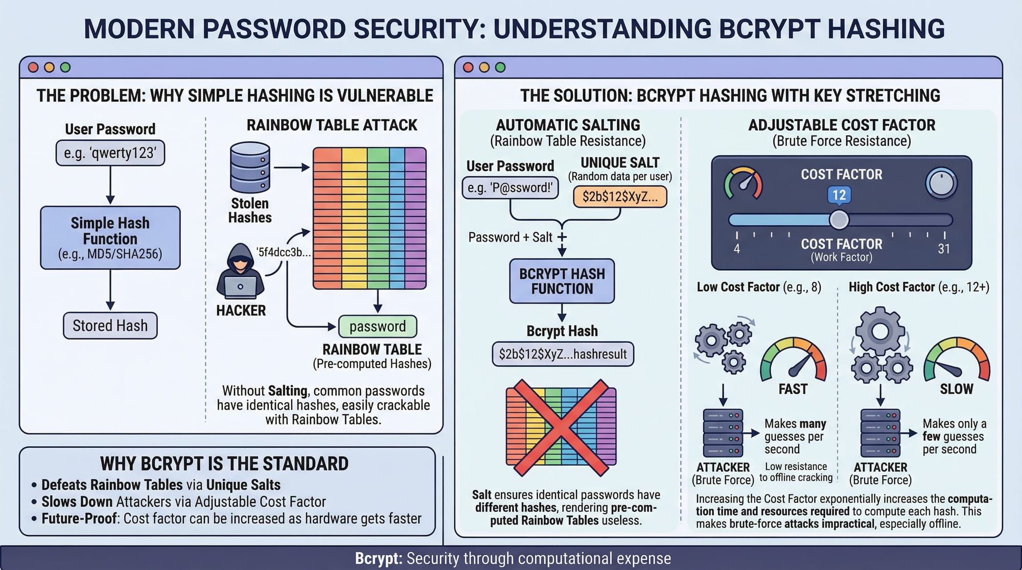 - Password storage (e.g., storing hashed passwords instead of plain text)