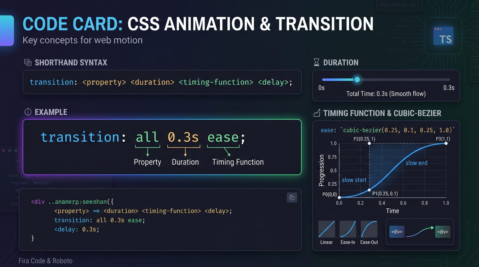 .button→ Selects the elementbackground-color: blue;→ Initial colortransition: background-color 0.3s ease;→ Defines animationbackground-color→ property to animate0.3s→ durationease→ timing function