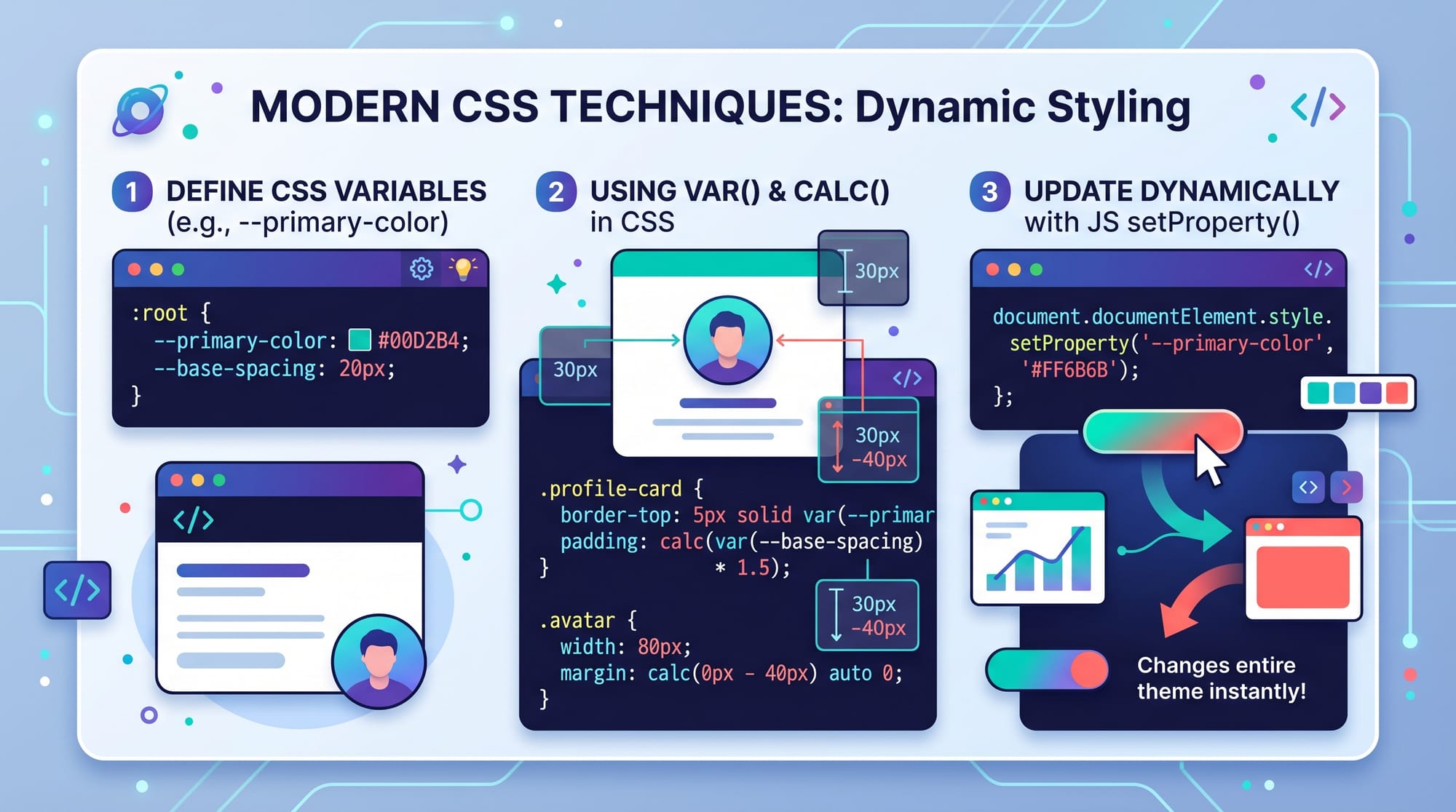 document.documentElement→ targets:rootsetProperty()→ updates variable value- Instantly updates UI without reloading page