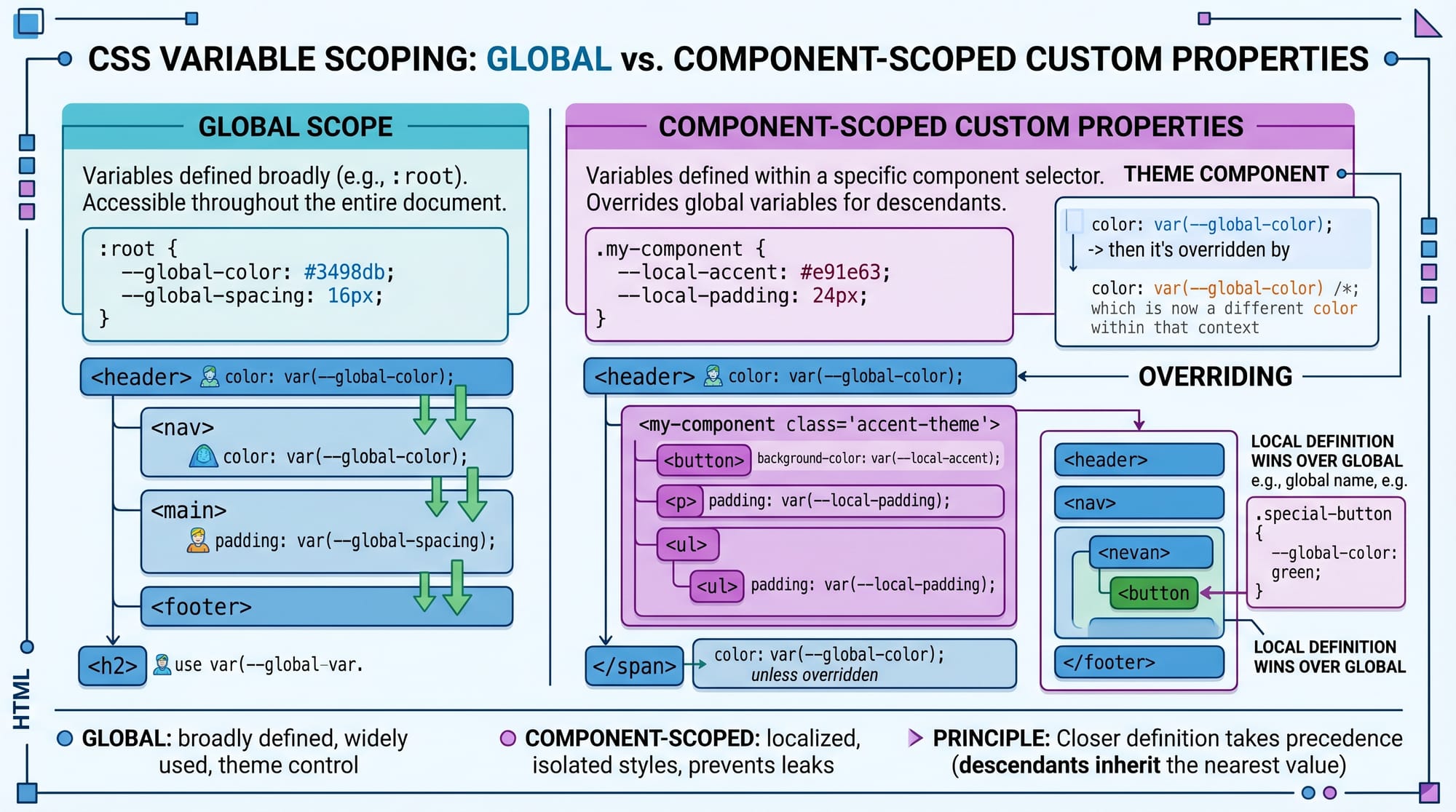:rootfor global variables - Use component scope only when needed
