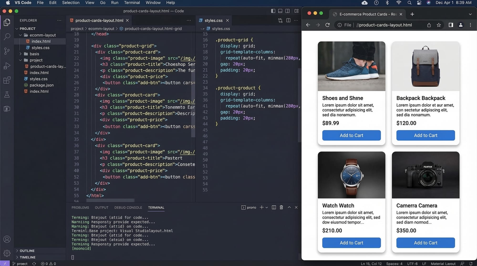 .products { display: flex; flex-wrap: wrap; }— allows cards to wrap on small screens.justify-content: space-between;— spreads cards evenly..product-card { flex: 1 1 200px; }— each card is flexible but respects a minimum width of 200px.- Other styling adds borders, padding, and background for better UX.