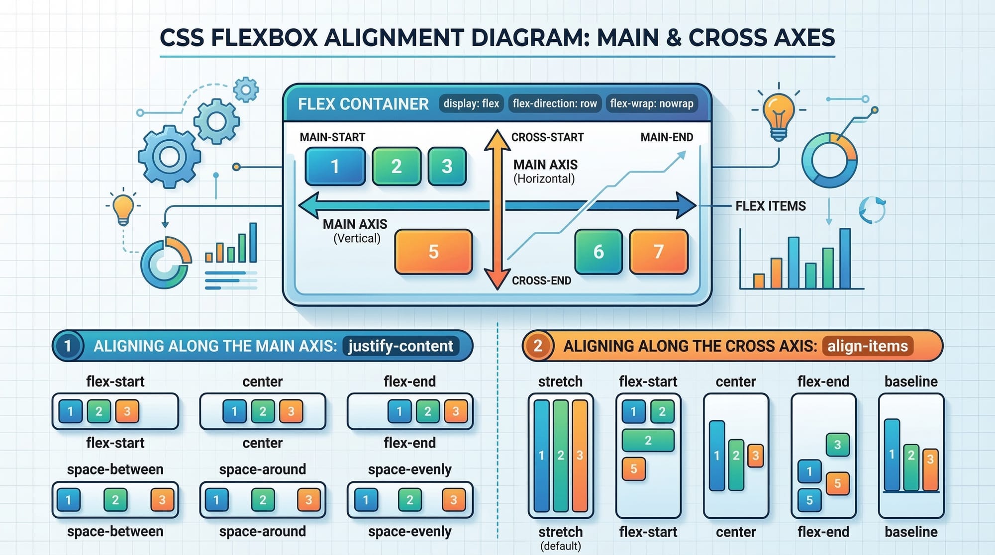 flex-direction: Determines main axis (row, column)flex-wrap: Controls wrapping behaviorjustify-content: Aligns items along the main axisalign-items: Aligns items along the cross-axisalign-content: Aligns multiple lines along cross-axis