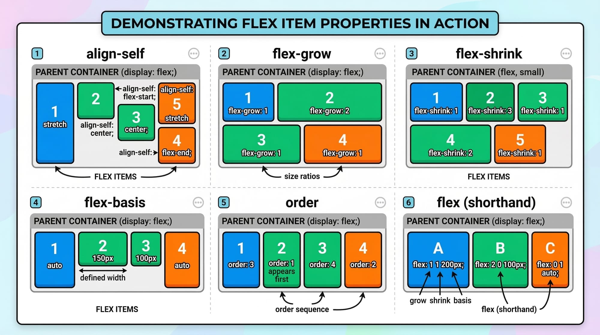 flex-grow: 1;— makes each item flexible and able to grow equally.flex-shrink: 1;— allows items to shrink proportionally when container is smaller.flex-basis: 200px;— sets default size.align-self: flex-start;— aligns this item to the top of the container, ignoring the container’salign-items.