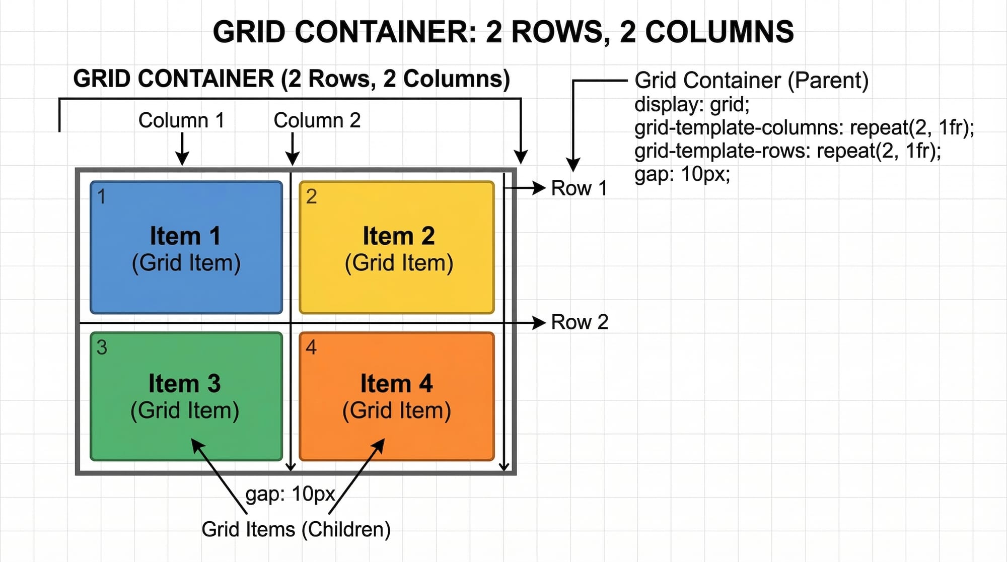 display: grid;– Activates the grid layout.grid-template-columns– Defines the width of each column using fractions (fr), percentages, or pixels.grid-template-rows– Sets the height for each row.gap– Adds spacing between items without needing margins.