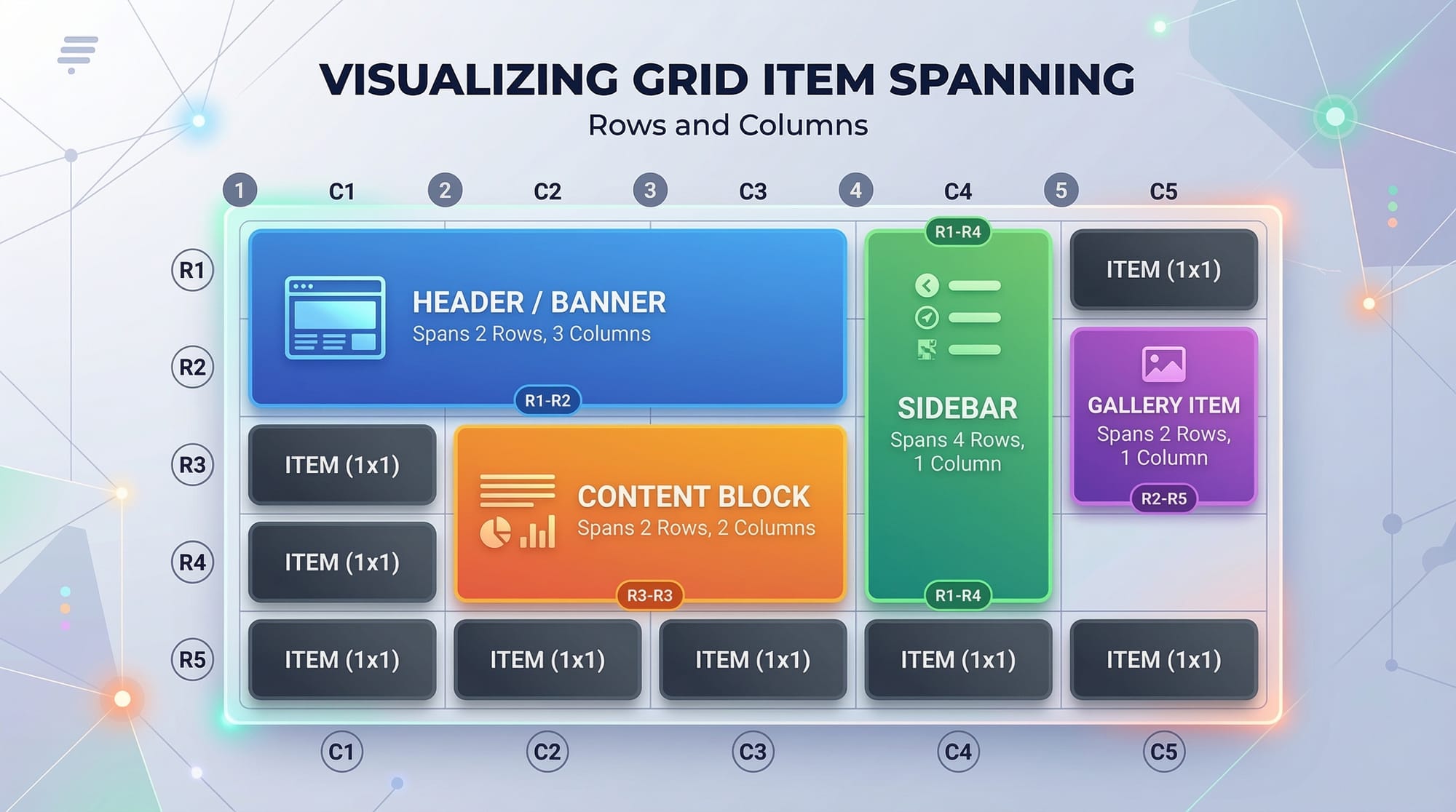 display: gridon a container and definegrid-template-columnsandgrid-template-rows. - Grid items can span multiple rows/columns using