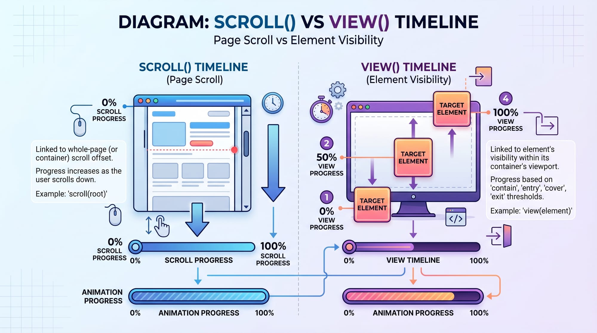 Use scroll() when you want animations tied to the whole page scroll. Use view() when animations depend on element visibility in the viewport.