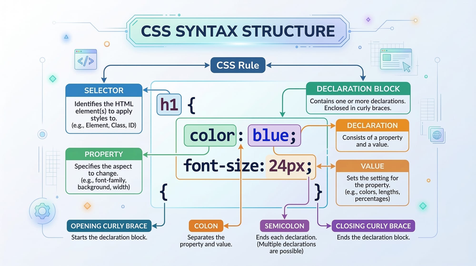 p→ selector targeting all paragraph elementscolor→ property specifying text colorblue→ value applied to the propertyfont-size→ property controlling text size