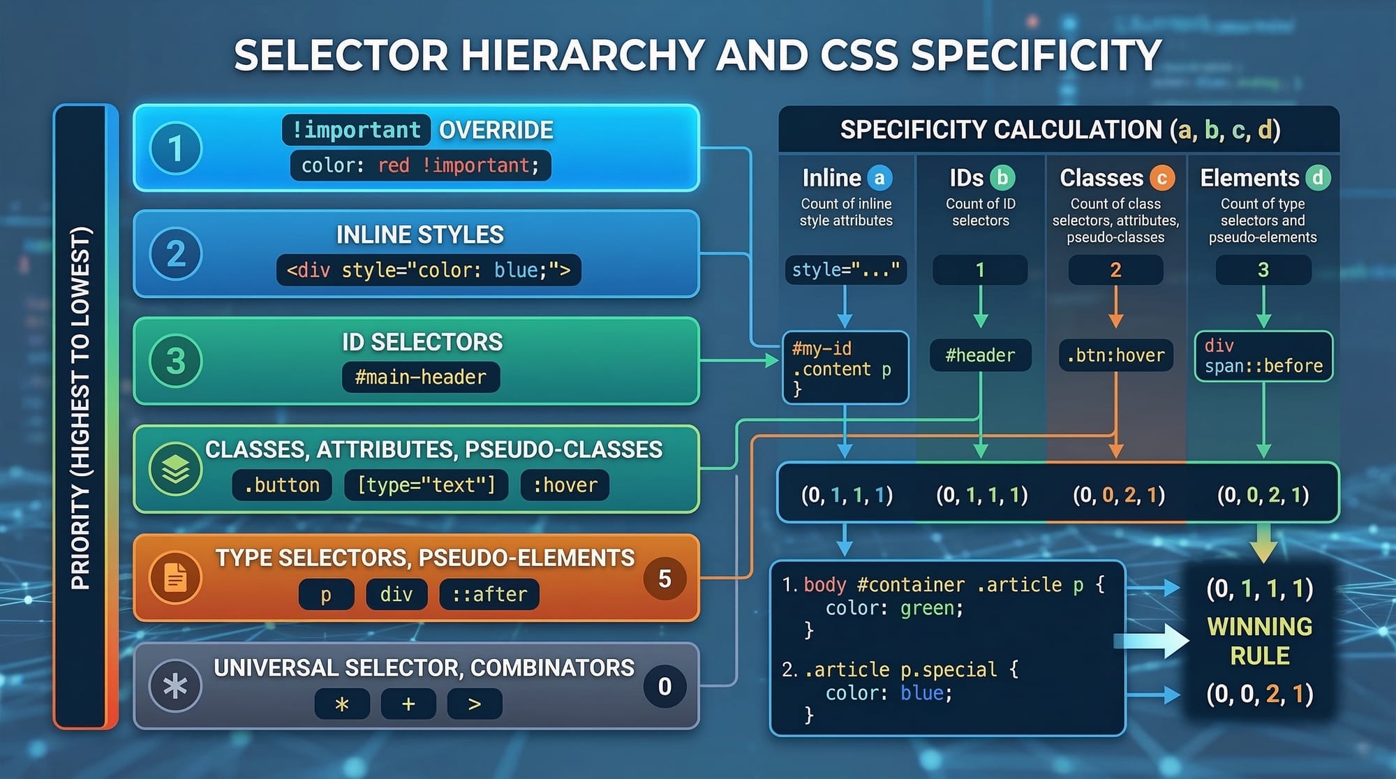 #main-titletargets only this heading.- ID selectors are ideal for unique sections like headers, footers, or main titles.