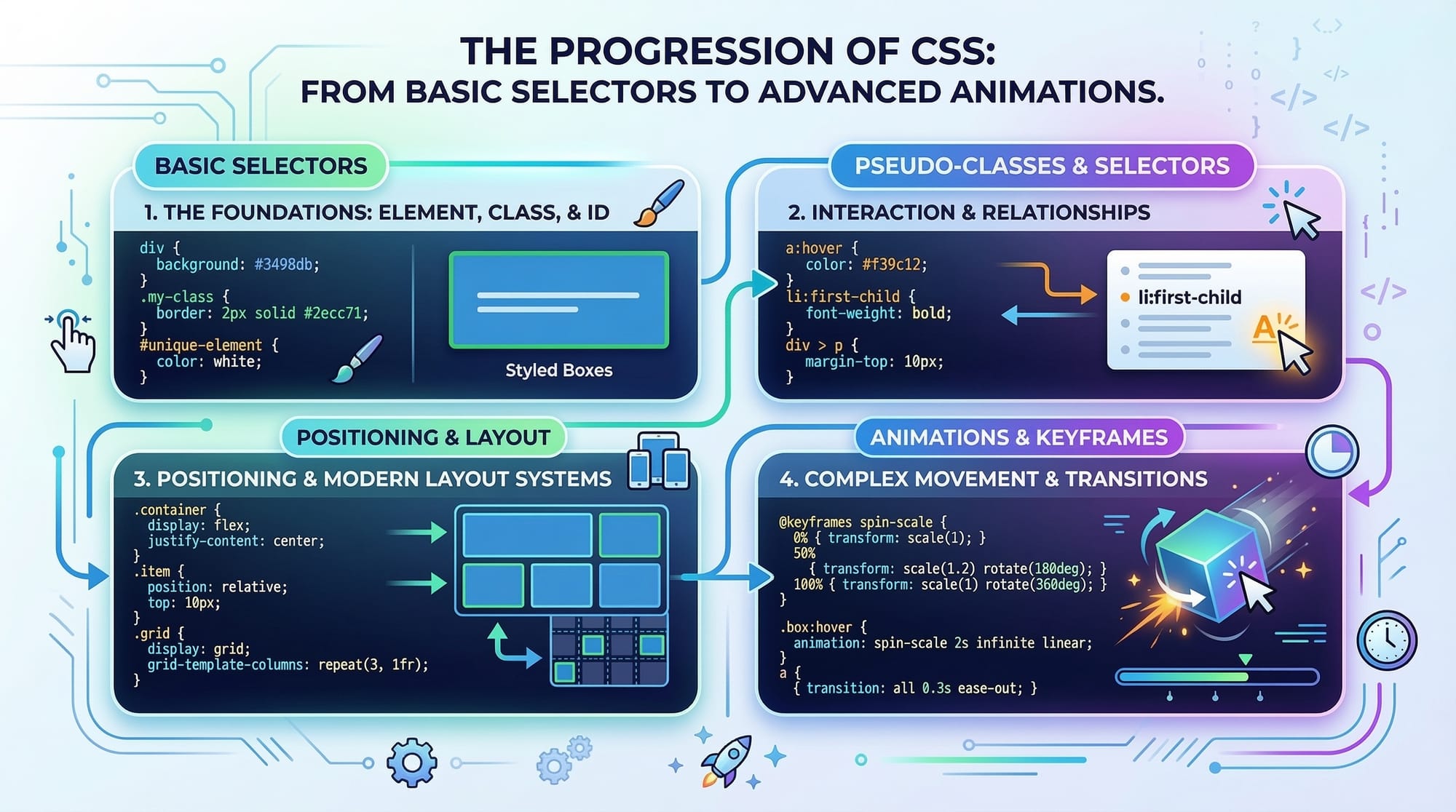 - Dive into CSS Transitions & Animations to make websites interactive.