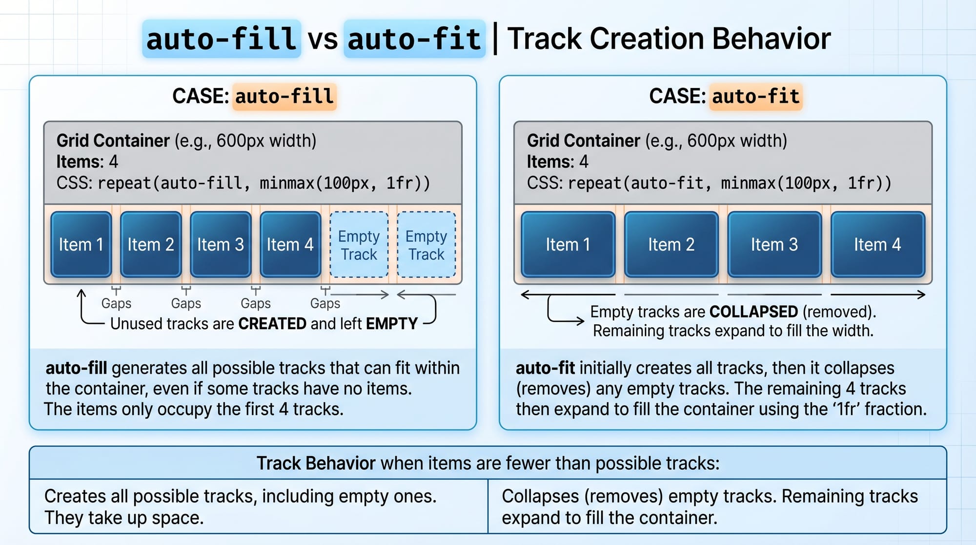 auto-fill: Keeps empty tracks.auto-fit: Collapses empty tracks and stretches items.